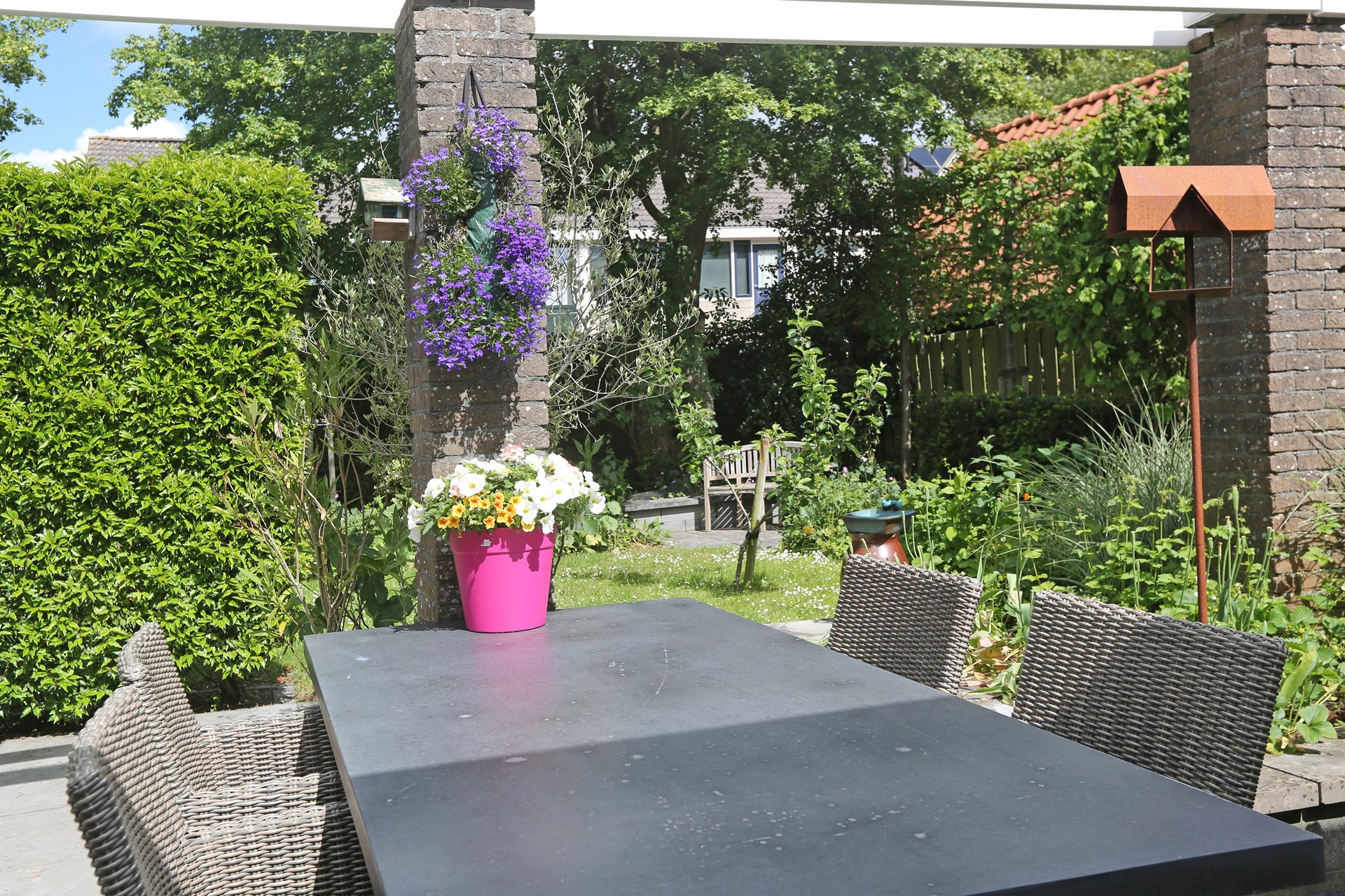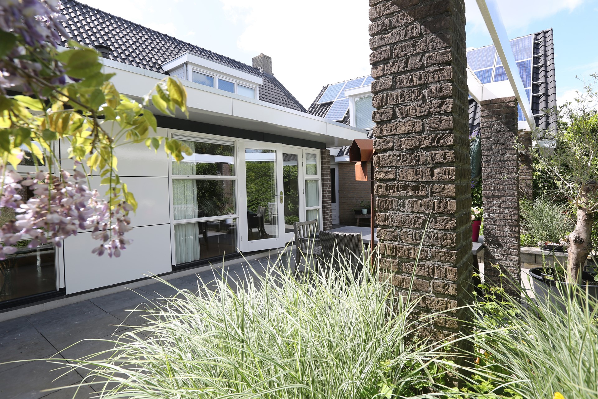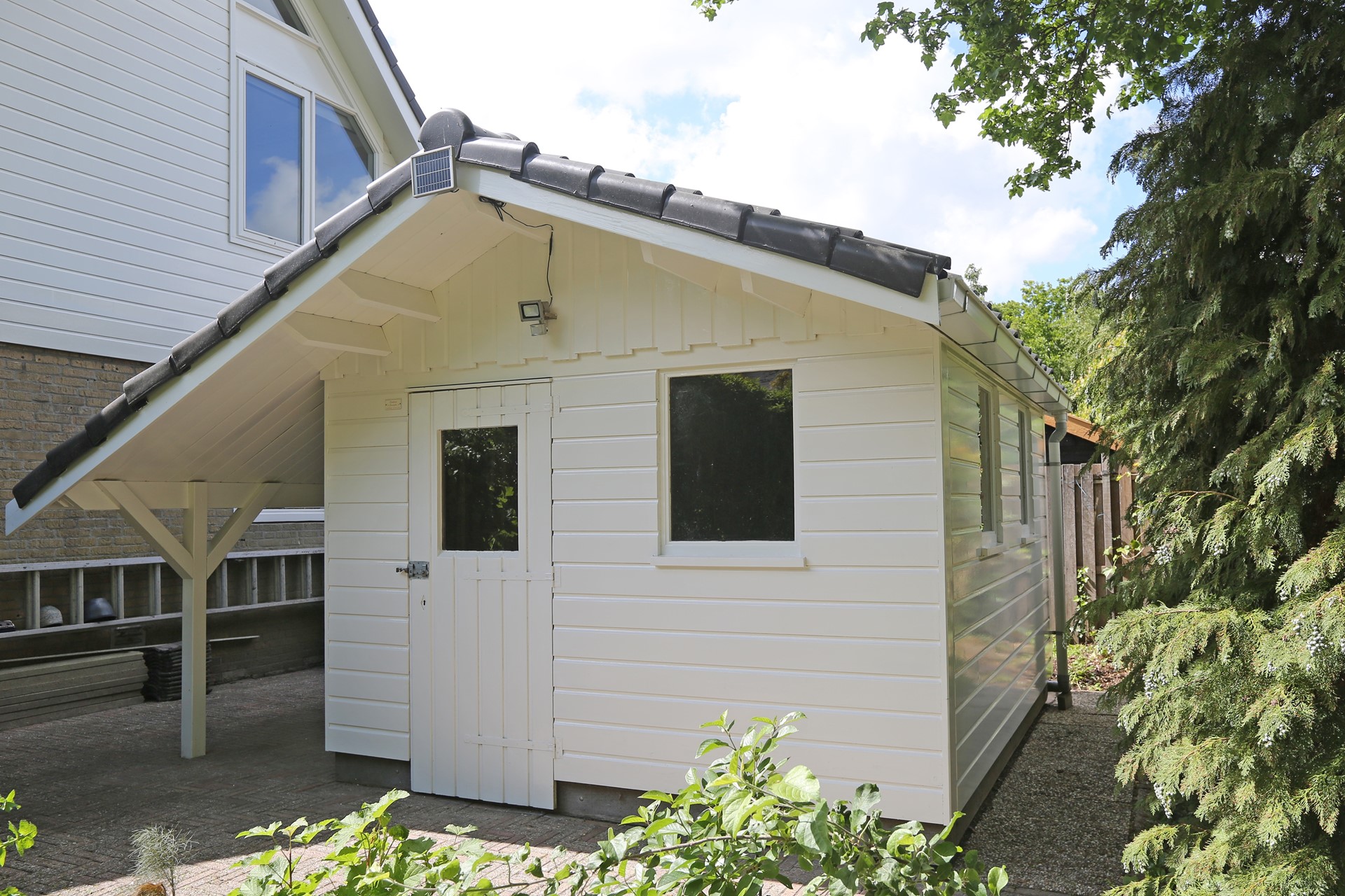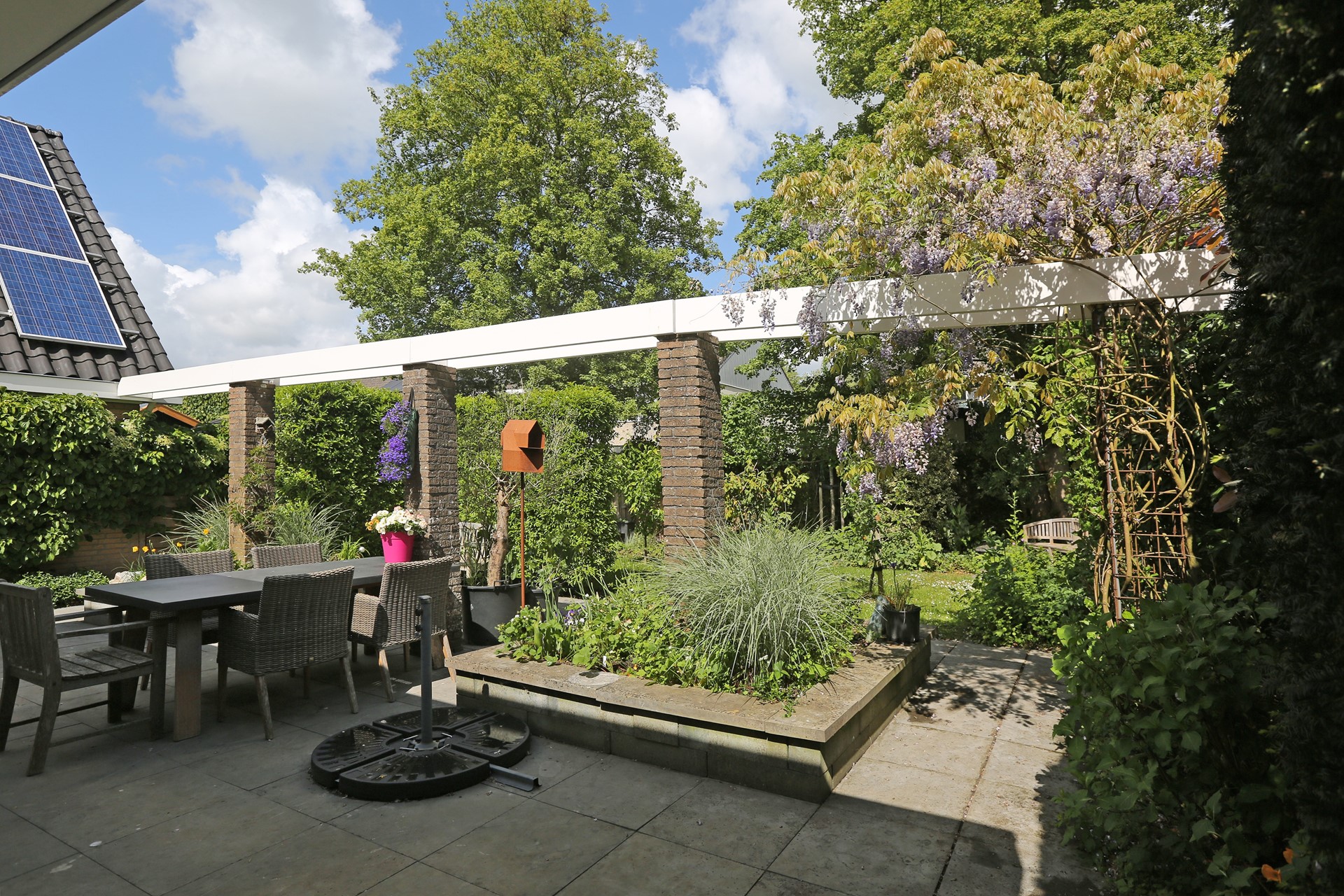 De woning staat op 730m² eigen grond en heeft rondom een fraai aangelegde en goed onderhouden tuin. Aan de voorzijde is plaats voor 3 auto’s en er is een eigen laadpaal. In de achtertuin is veel groen en er zijn diverse terrassen, er is altijd wel een plek te vinden in de zon, of juist in de schaduw. Achter de garage staat een witgekleurd tuinhuis, handig voor het tuingereedschap en opslag van tuinstoelen en kussens.