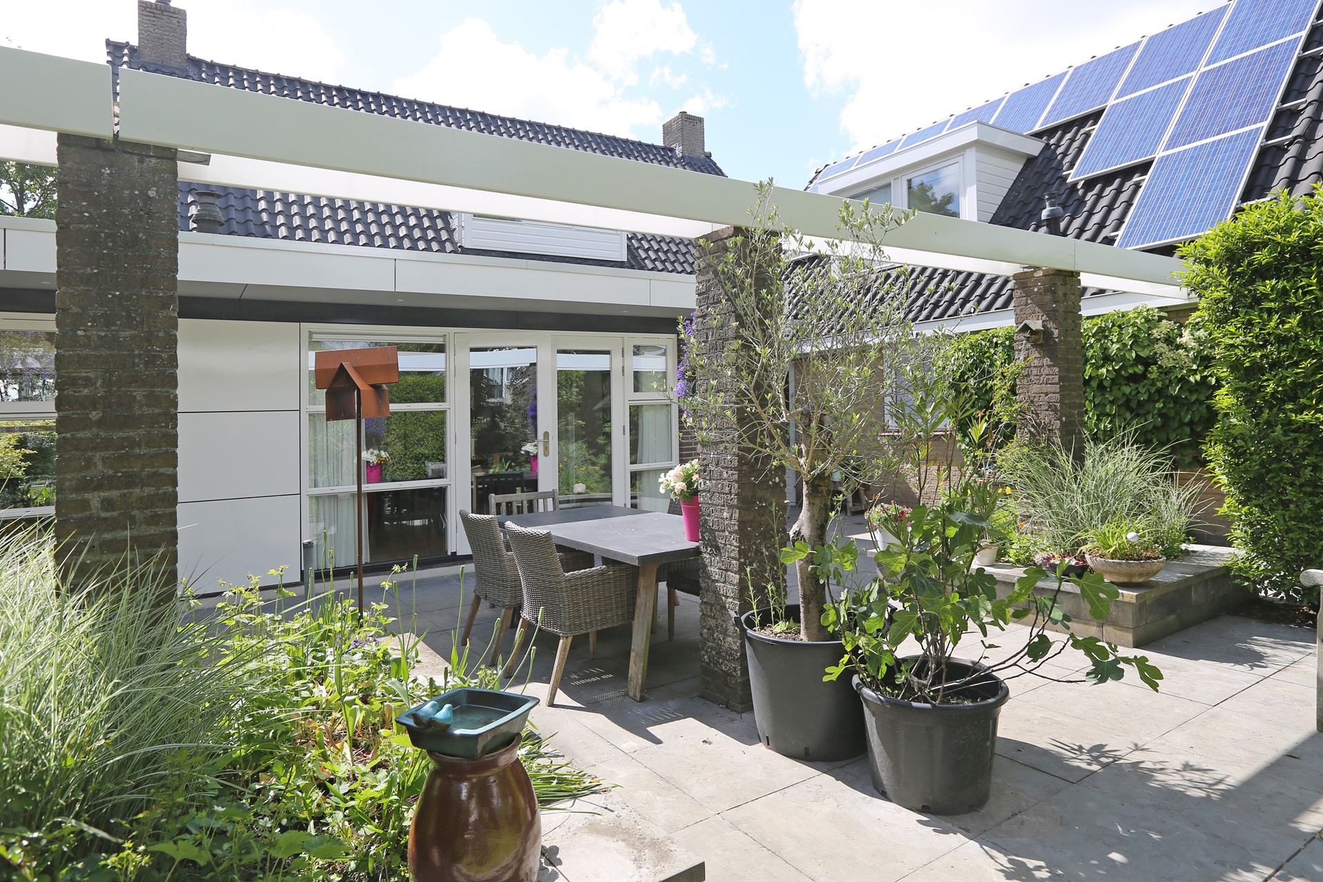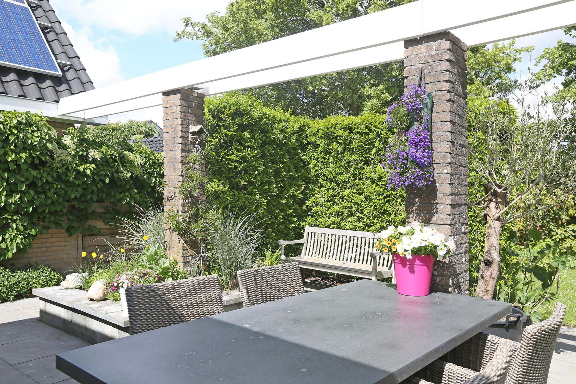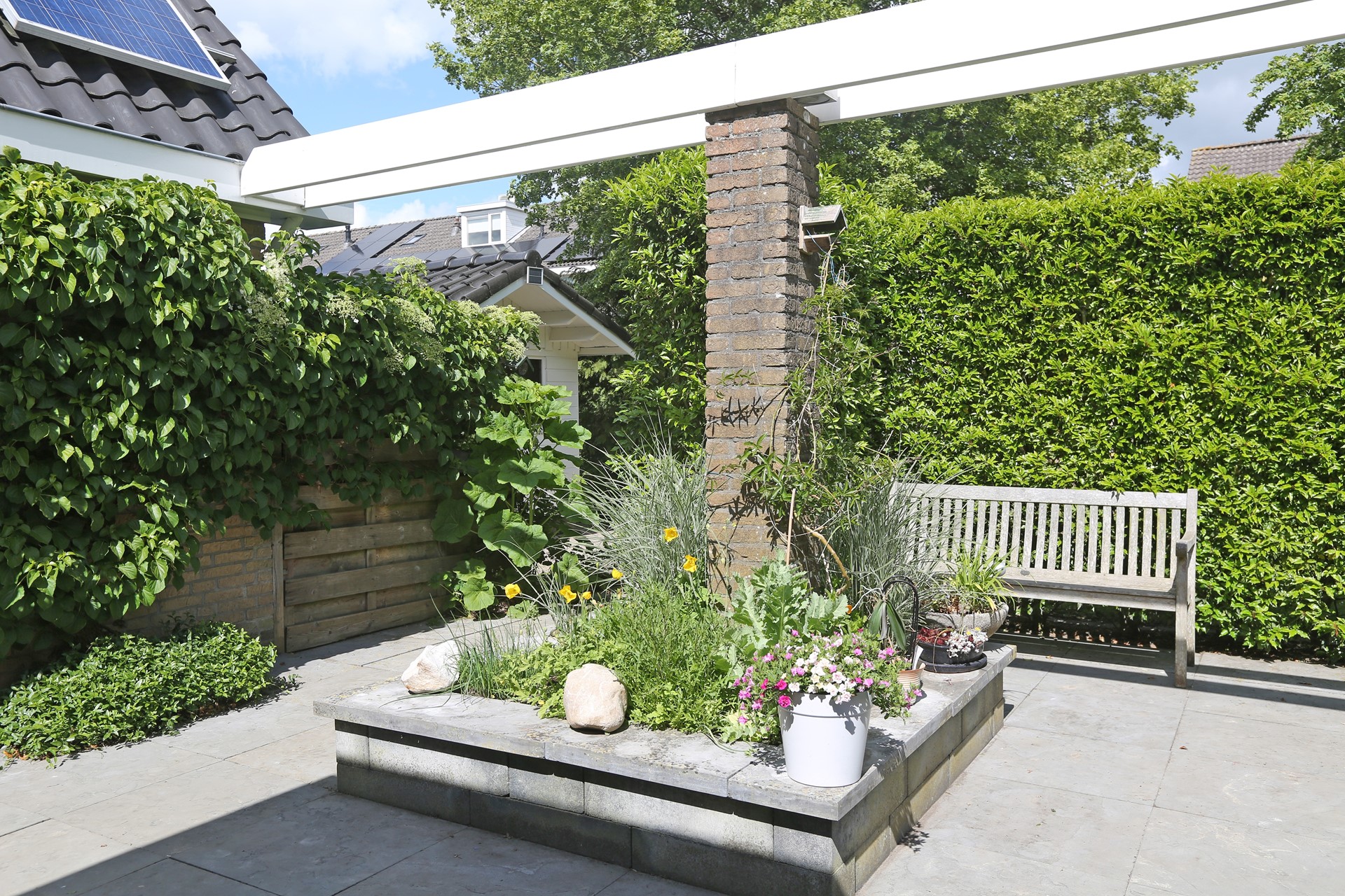 De woning staat op 730m² eigen grond en heeft rondom een fraai aangelegde en goed onderhouden tuin. Aan de voorzijde is plaats voor 3 auto’s en er is een eigen laadpaal. In de achtertuin is veel groen en er zijn diverse terrassen, er is altijd wel een plek te vinden in de zon, of juist in de schaduw. Achter de garage staat een witgekleurd tuinhuis, handig voor het tuingereedschap en opslag van tuinstoelen en kussens.