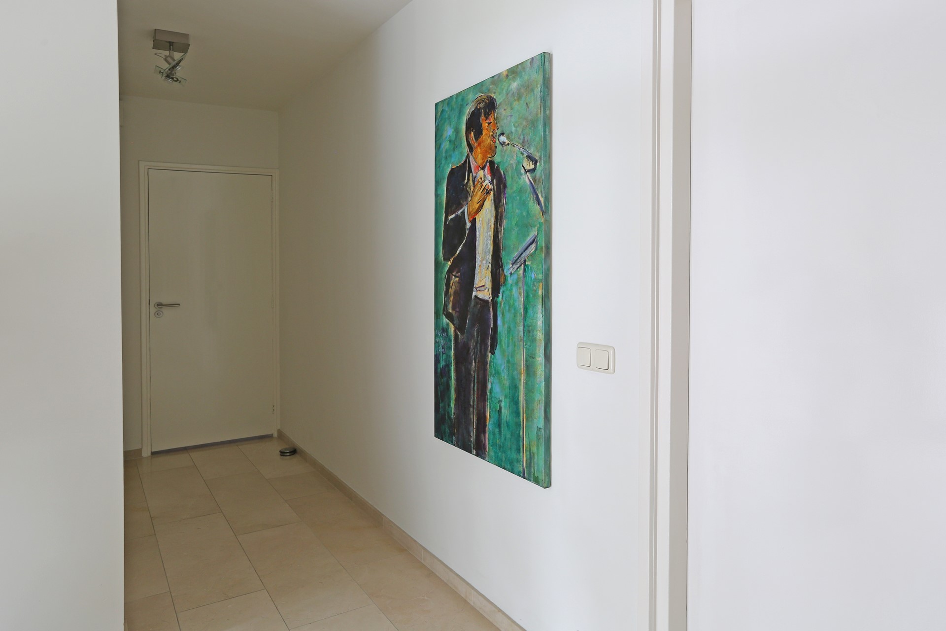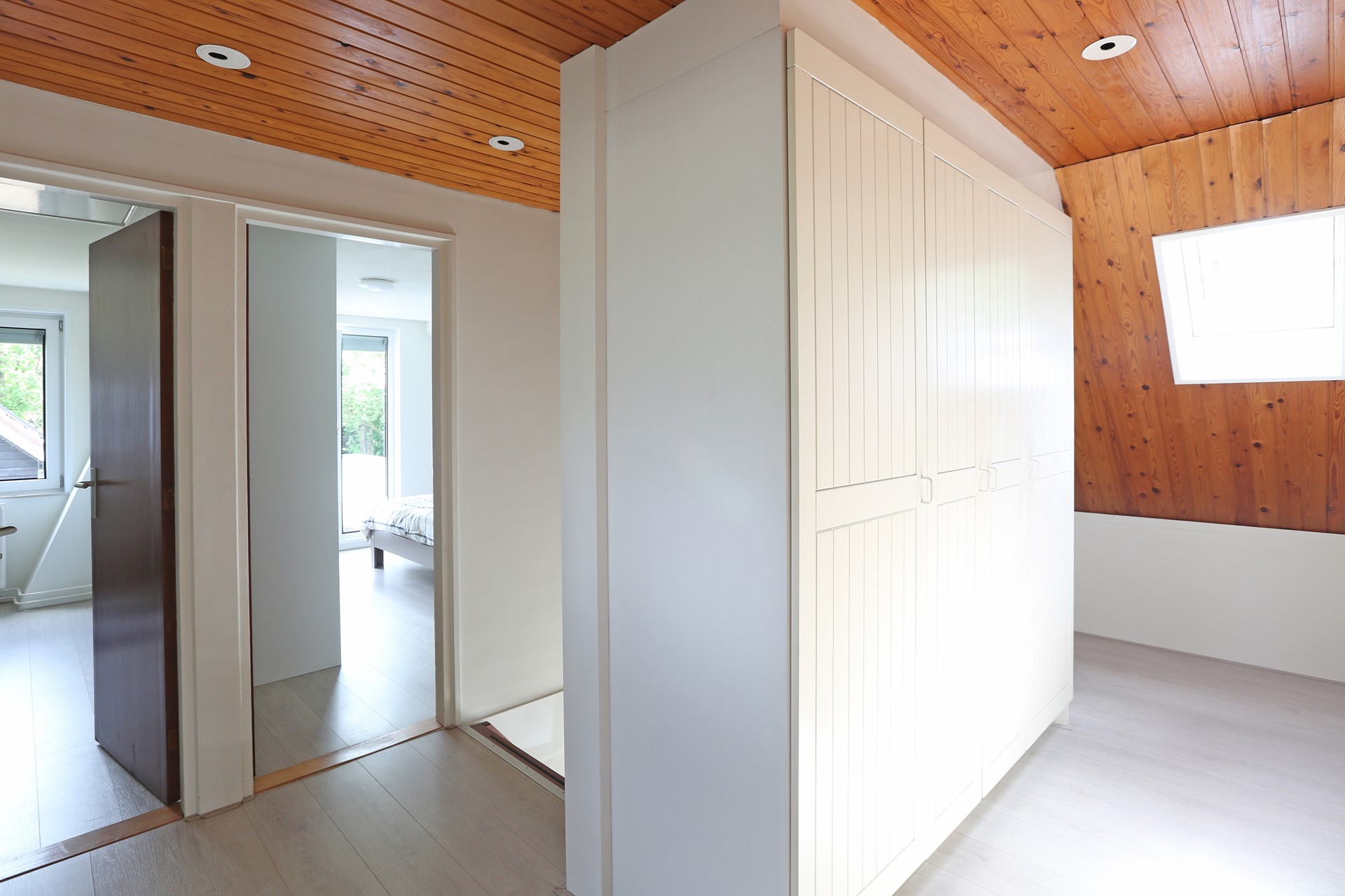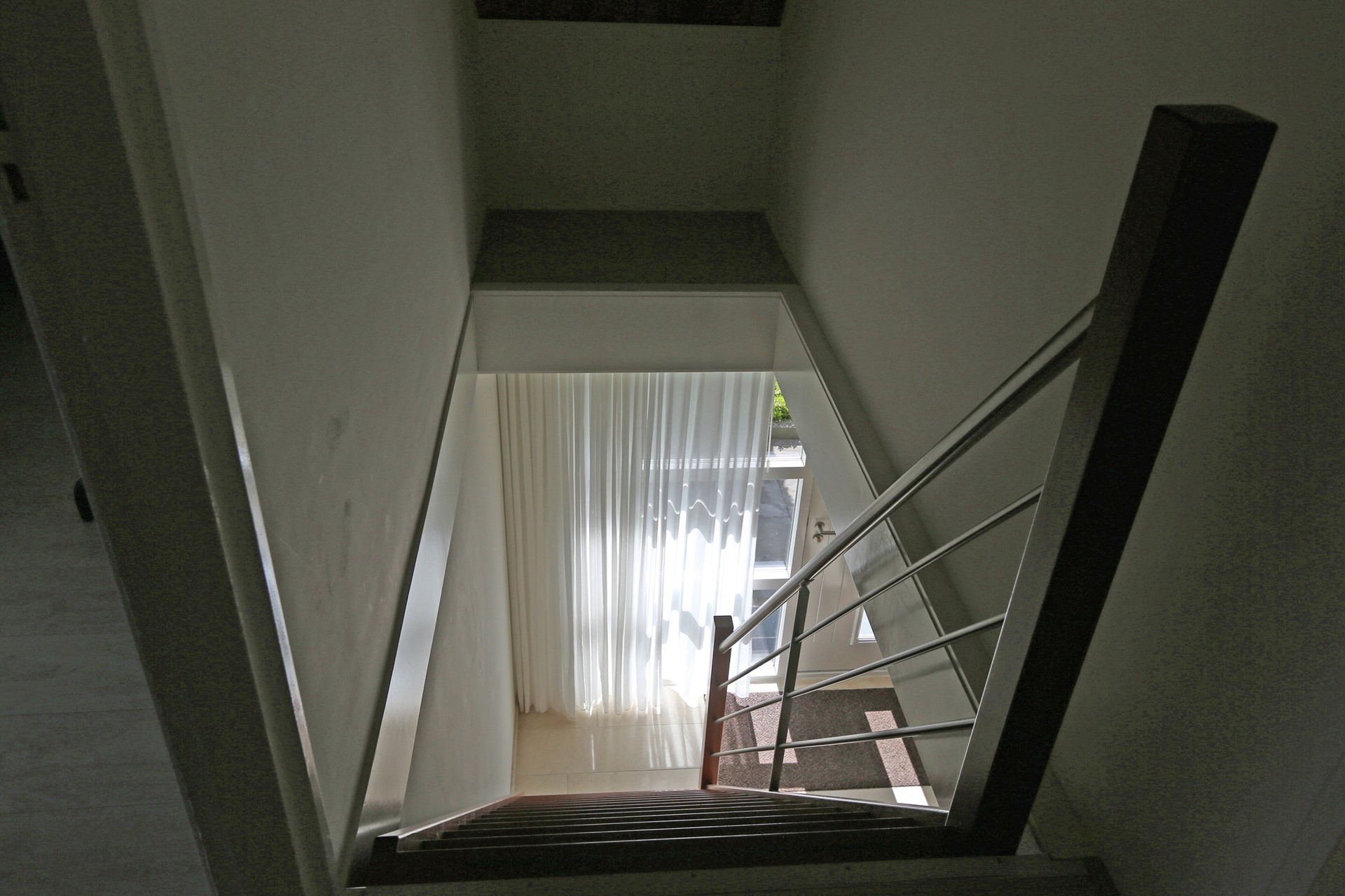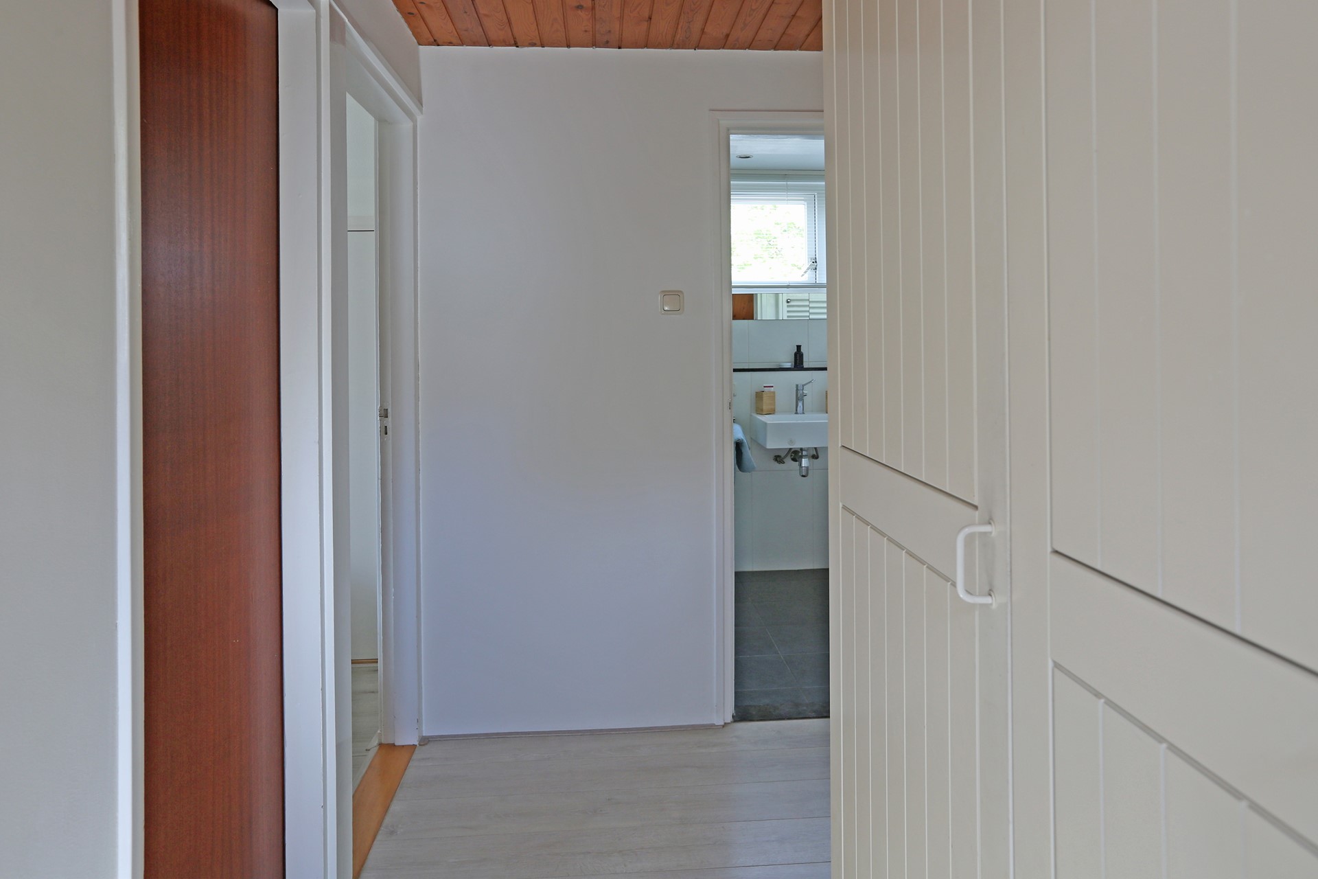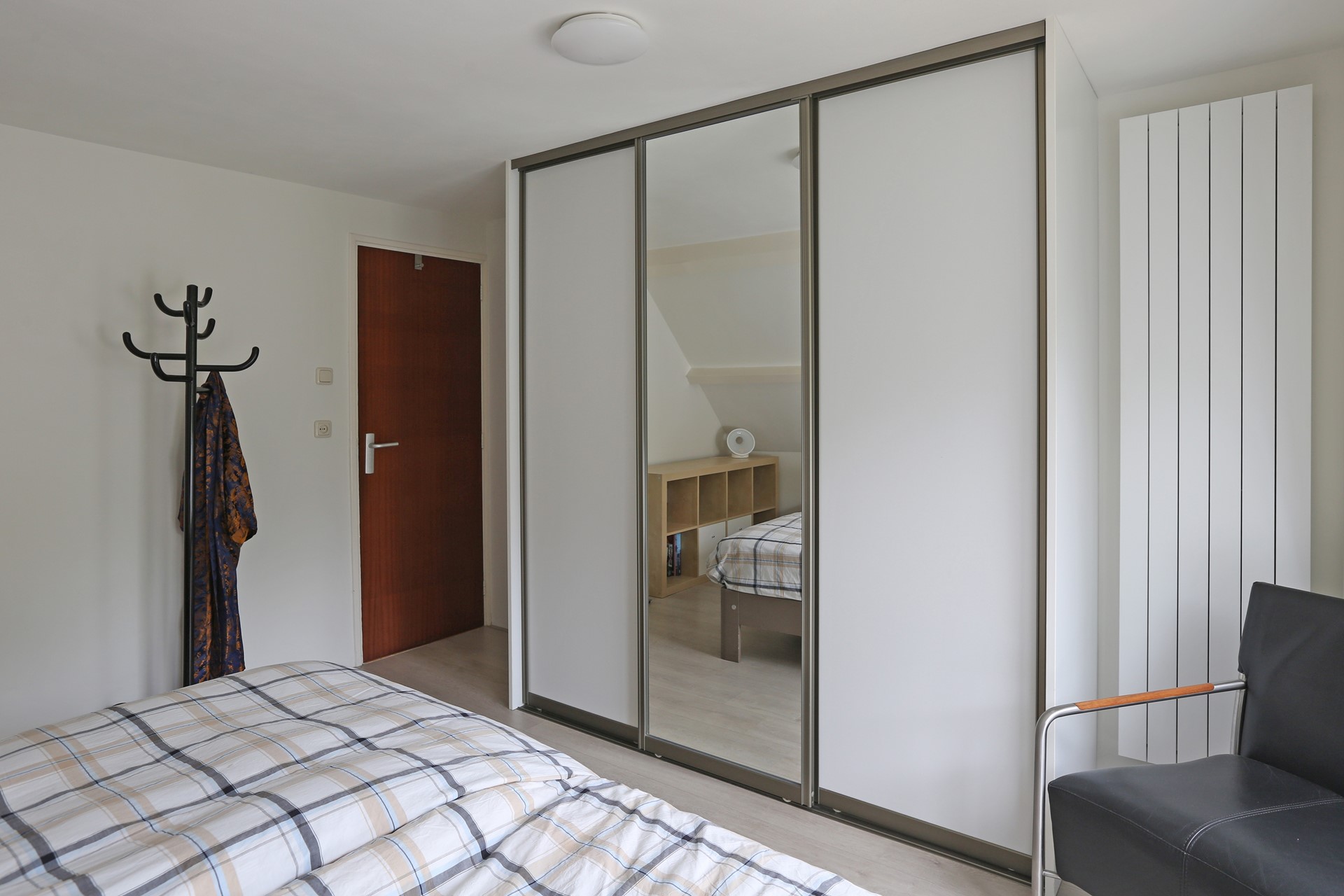 Overloop met vaste kastenwand, 4 slaapkamers, waarvan 3 met een wastafel, 2 met een vaste kast en één met een deur naar een klein balkon, badkamer met bubbelbad, wastafelmeubel, douchehoek en toilet. Vanuit één slaapkamer is er een luik met Vlizotrap naar de zolder op de 2e verdieping.