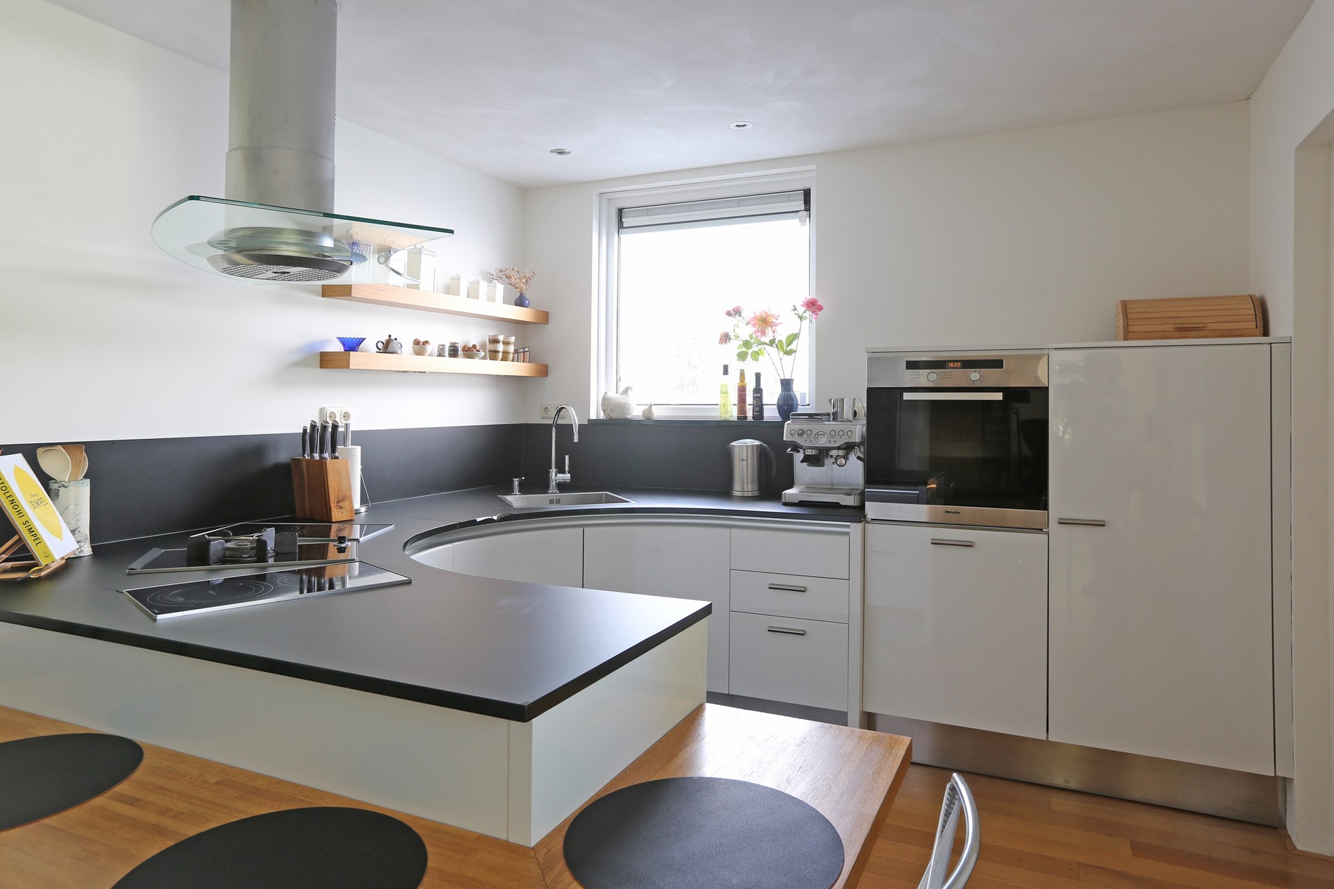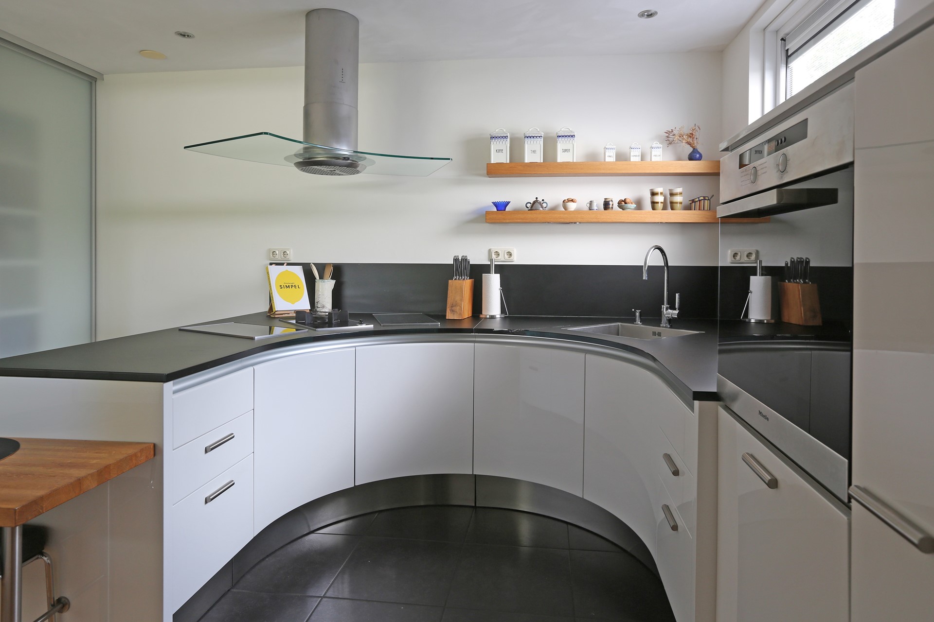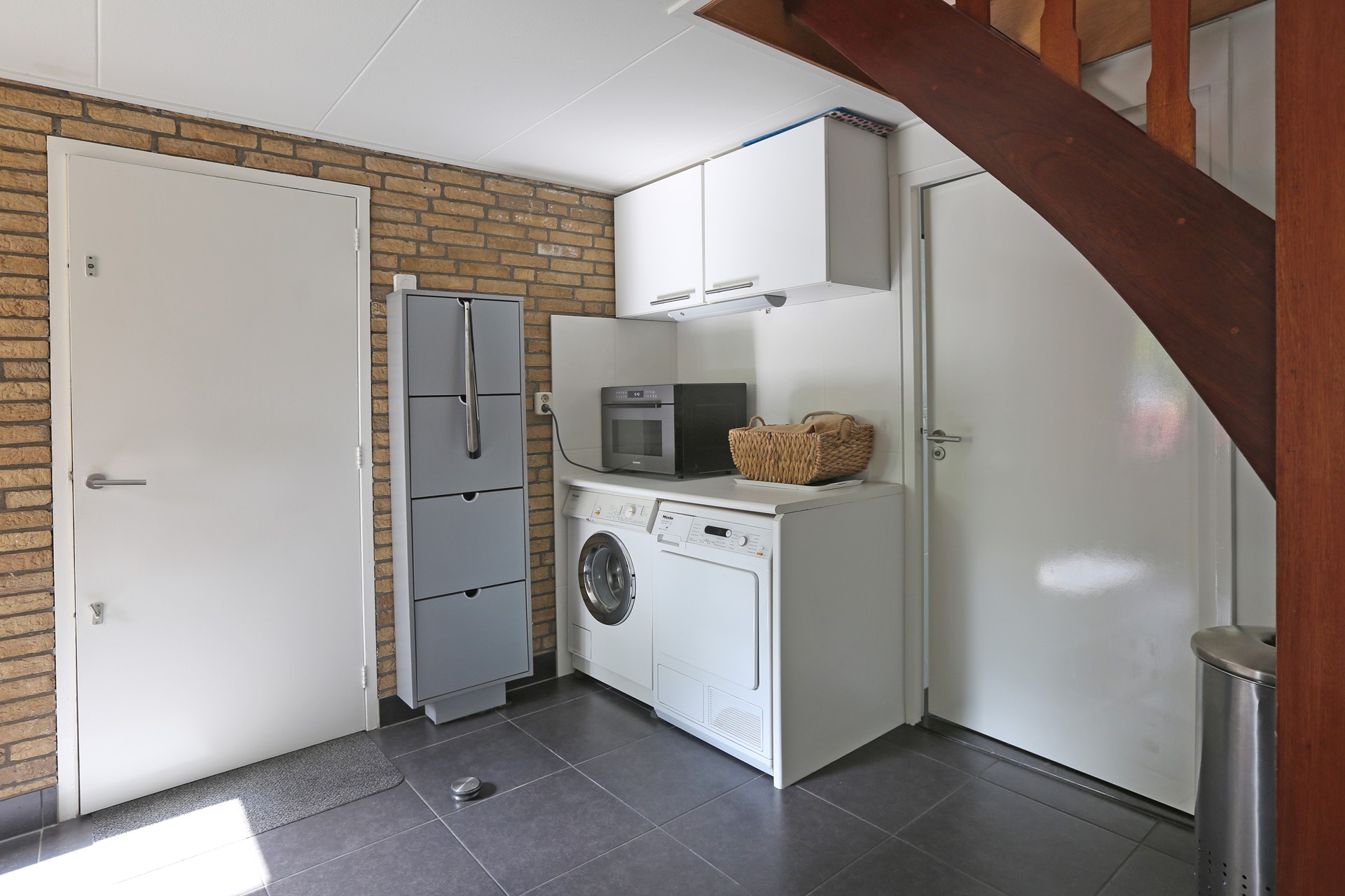 Entree, royale hal met open trap naar de verdieping, werkkamer met inbouwkast, schuifkast als garderobekast waarin tevens de meterkast is weggewerkt, toilet, mooie lichte woonkamer aan de voorzijde van de woning die in open verbinding staat met de aangebouwde tuinkamer aan de achterzijde, deze biedt eveneens ruimte voor een grote eettafel en er zijn openslaande deuren naar de tuin, doorloop naar de halfopen keuken met een vaste kastenwand. De keuken is in een ronde vorm uitgevoerd, witgekleurd met een zwart glazen aanrechtblad, een aangebouwd zithoekje en inbouwapparatuur, waaronder inductiekookplaat, afzuigkap, elektrische oven, koelkast en vaatwasser. Vanuit de keuken doorloop naar de bijkeuken met wasmachine-aansluiting, een deur naar de voorkant van de woning, naar de garage en naar de tuin, een trap naar de verdieping boven de garage en een royale badkamer met douchehoek, toilet, wastafelmeubel en sauna. De garage heeft een afmeting van ca. 8 x 3,8 m, is voorzien van een elektrische garagedeuropener en aan de achterzijde is nog een extra loopdeur naar de tuin.
