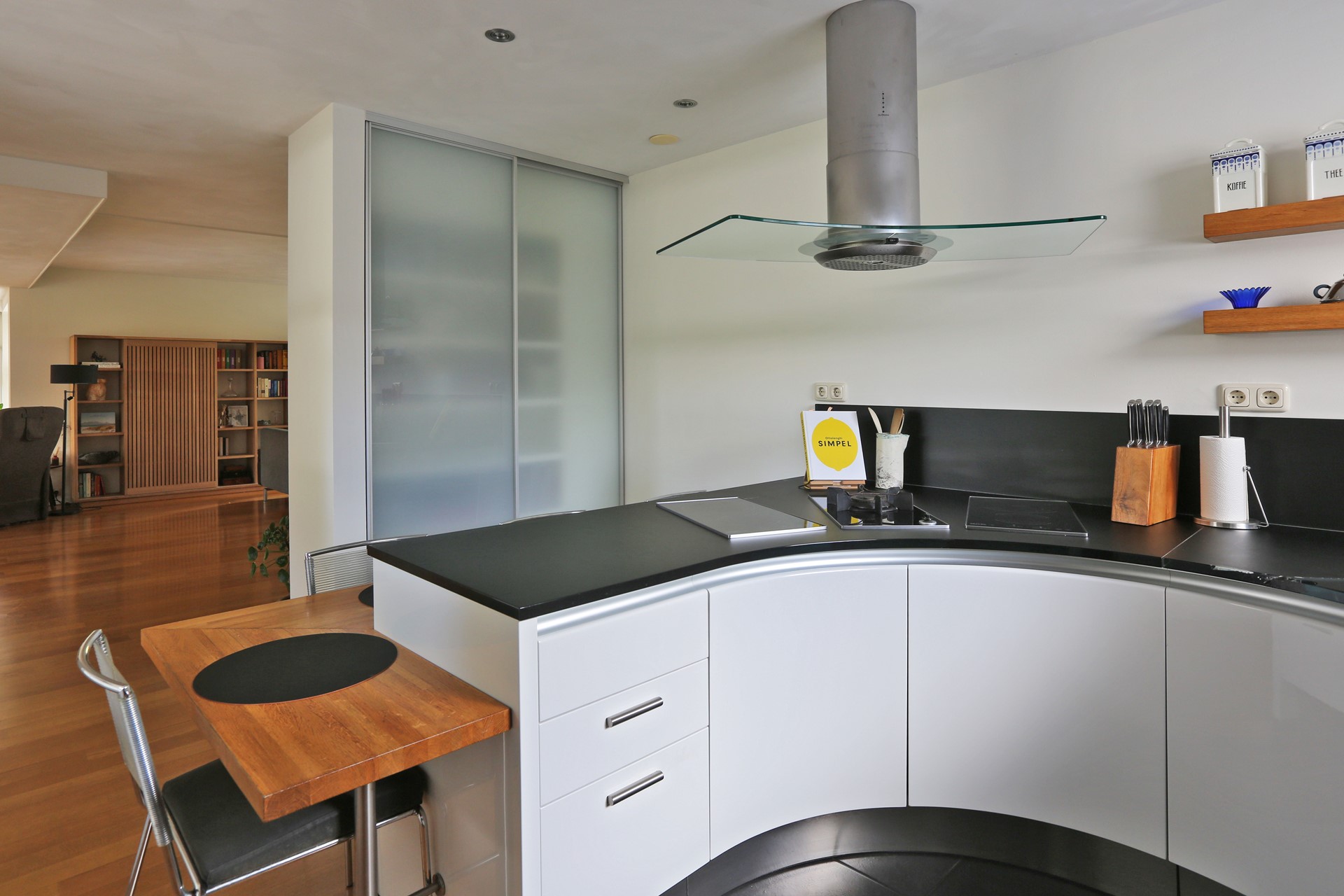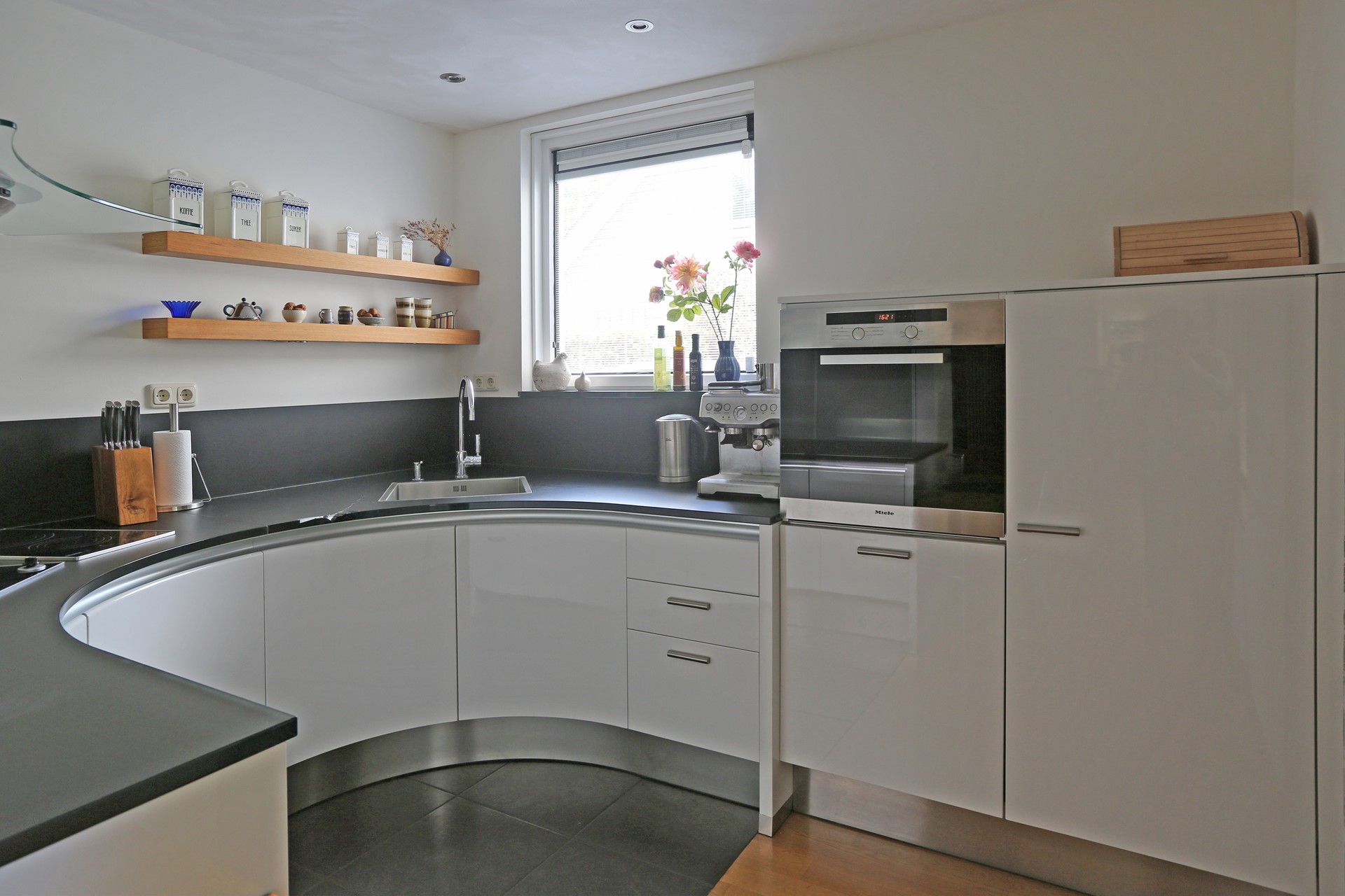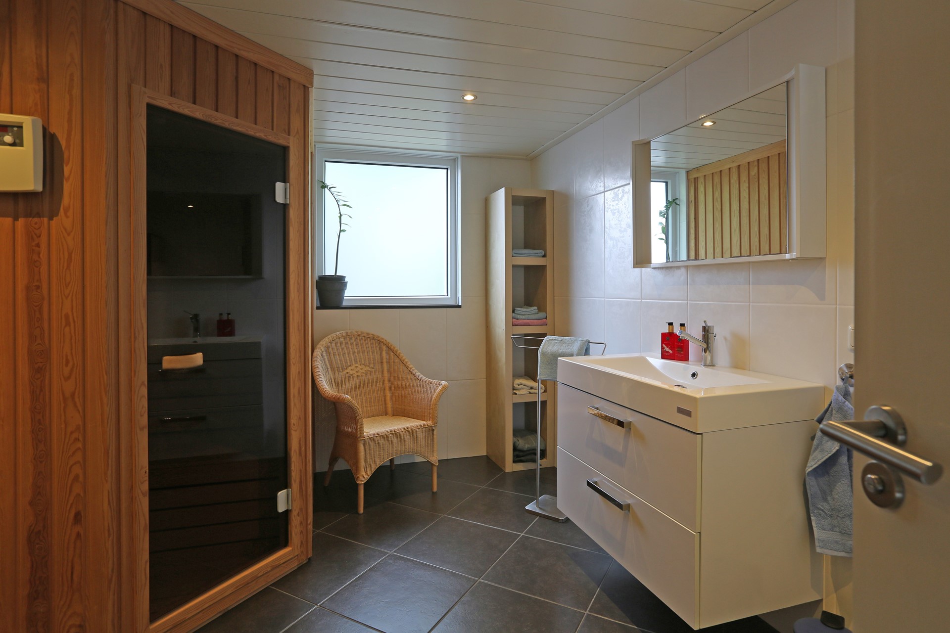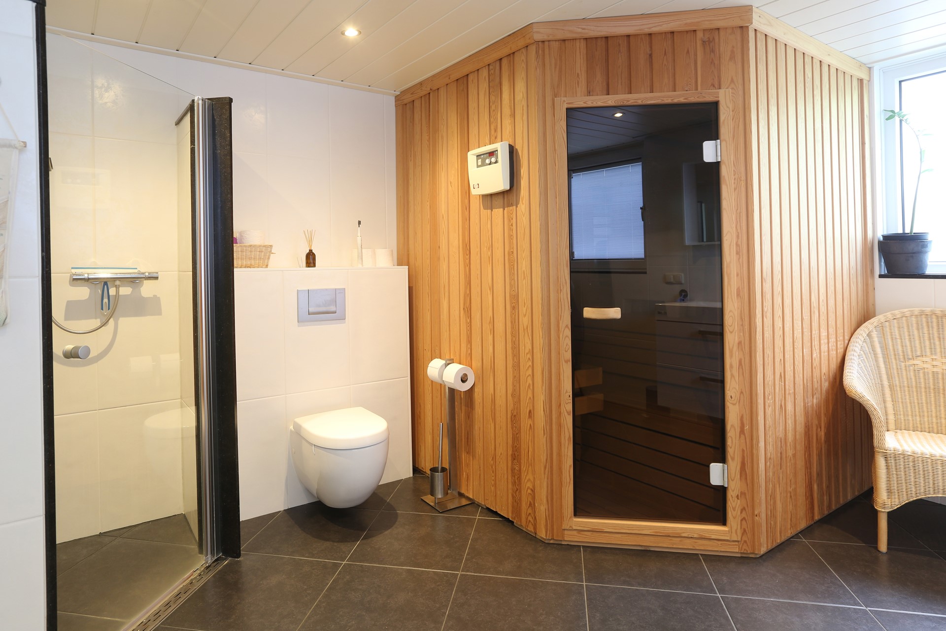 Entree, royale hal met open trap naar de verdieping, werkkamer met inbouwkast, schuifkast als garderobekast waarin tevens de meterkast is weggewerkt, toilet, mooie lichte woonkamer aan de voorzijde van de woning die in open verbinding staat met de aangebouwde tuinkamer aan de achterzijde, deze biedt eveneens ruimte voor een grote eettafel en er zijn openslaande deuren naar de tuin, doorloop naar de halfopen keuken met een vaste kastenwand. De keuken is in een ronde vorm uitgevoerd, witgekleurd met een zwart glazen aanrechtblad, een aangebouwd zithoekje en inbouwapparatuur, waaronder inductiekookplaat, afzuigkap, elektrische oven, koelkast en vaatwasser. Vanuit de keuken doorloop naar de bijkeuken met wasmachine-aansluiting, een deur naar de voorkant van de woning, naar de garage en naar de tuin, een trap naar de verdieping boven de garage en een royale badkamer met douchehoek, toilet, wastafelmeubel en sauna. De garage heeft een afmeting van ca. 8 x 3,8 m, is voorzien van een elektrische garagedeuropener en aan de achterzijde is nog een extra loopdeur naar de tuin.