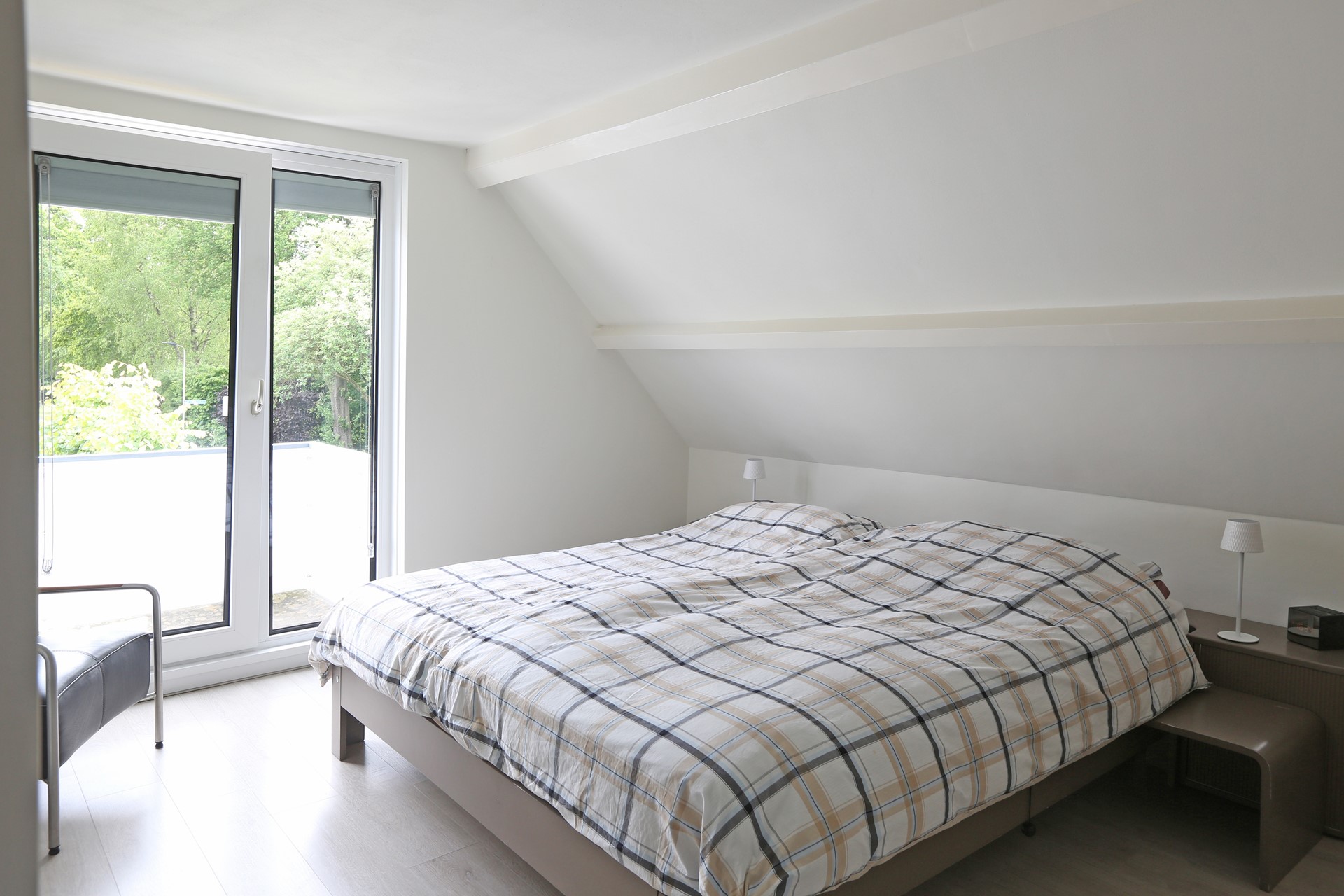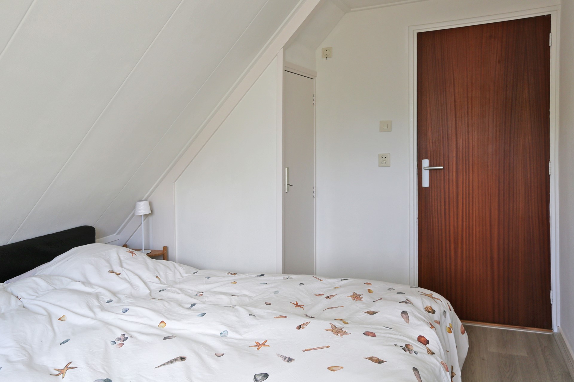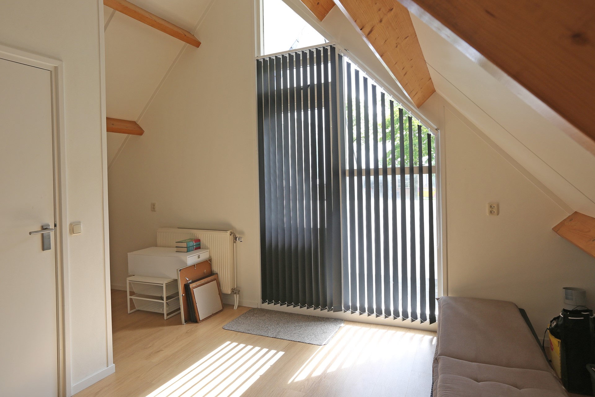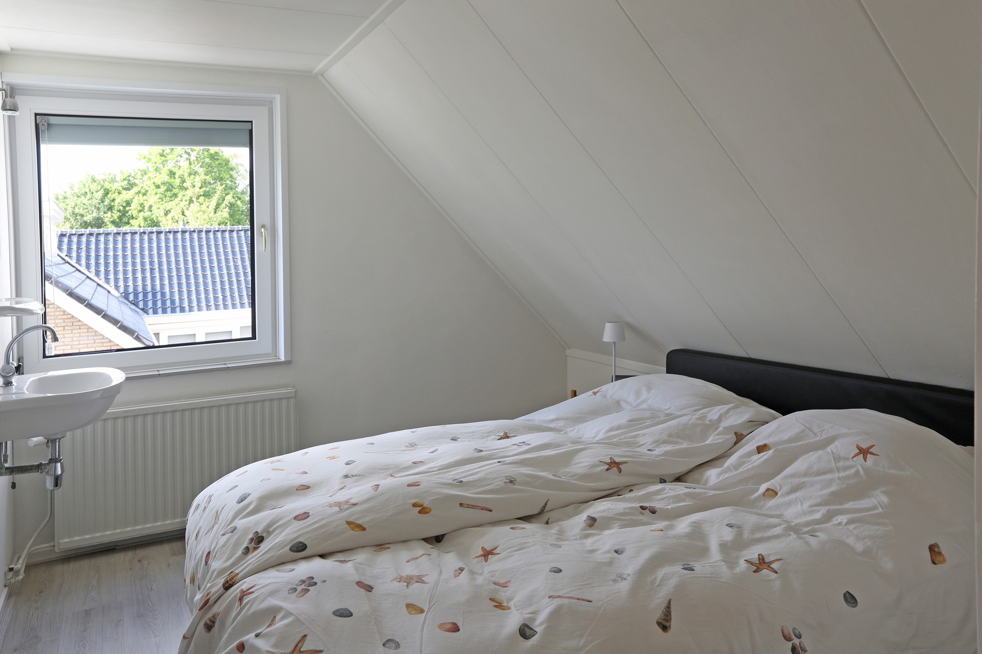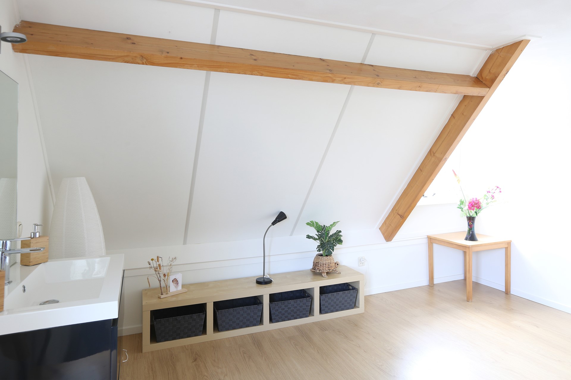 Kleine overloop, 2 slaapkamers, waarvan één met dakkapel en wastafel en één met deur naar balkon (loggia). Beide kamers hebben bergruimte achter de knieschotten en in de voorste kamer is een luik naar bergruimte in de nok.