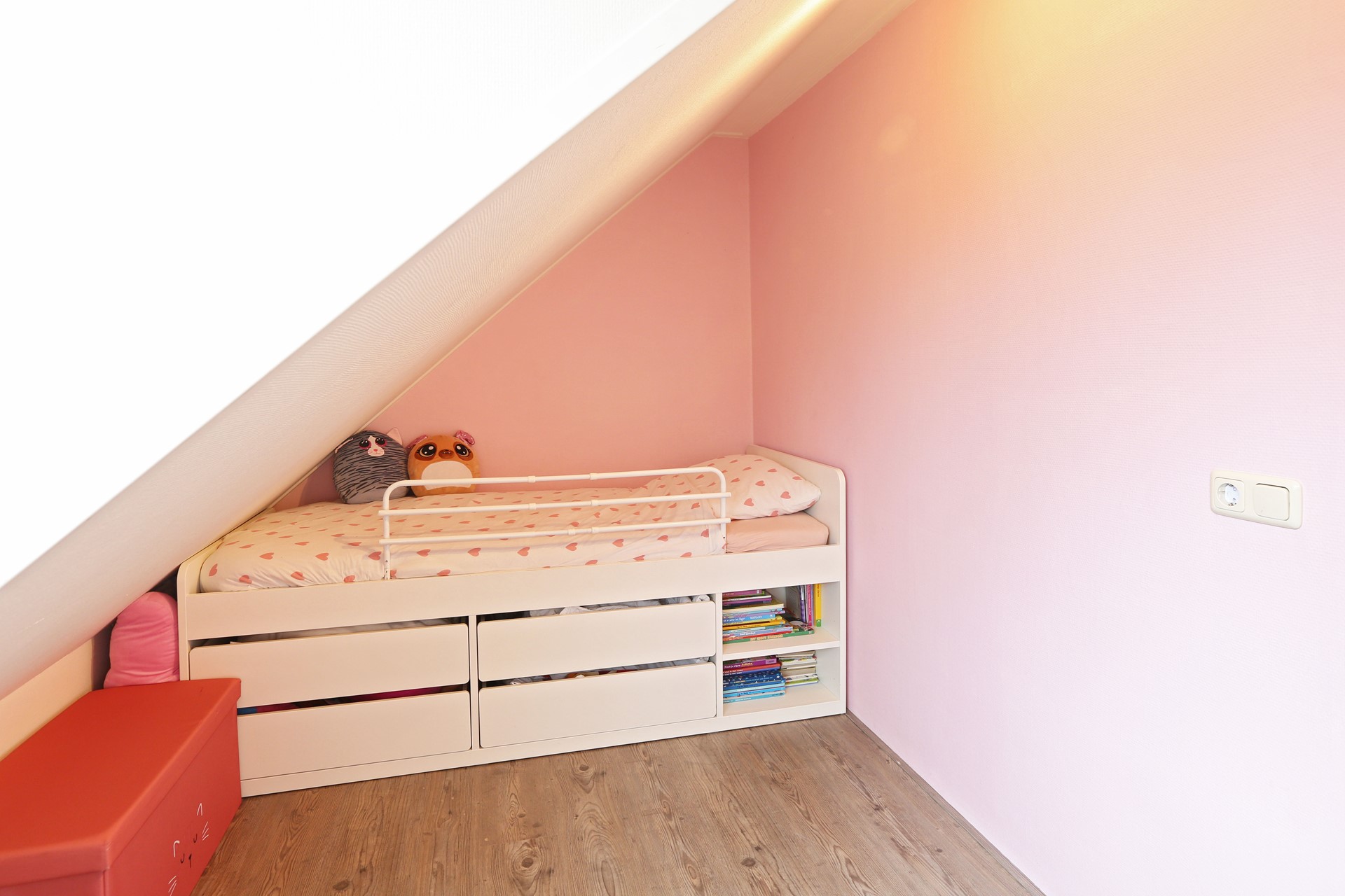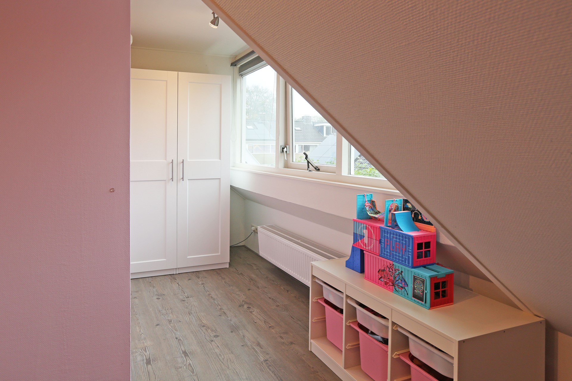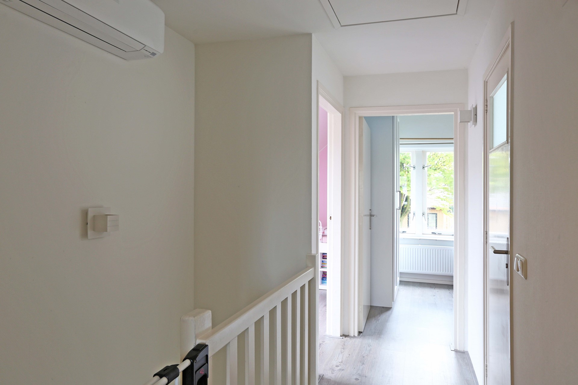 Overloop voorzien van een airco-unit en een vlizotrap naar de bergzolder, 3 slaapkamers (resp. 7, 9 en 14m²) en een badkamer voorzien van ligbad, douche, toilet en wastafelmeubel.