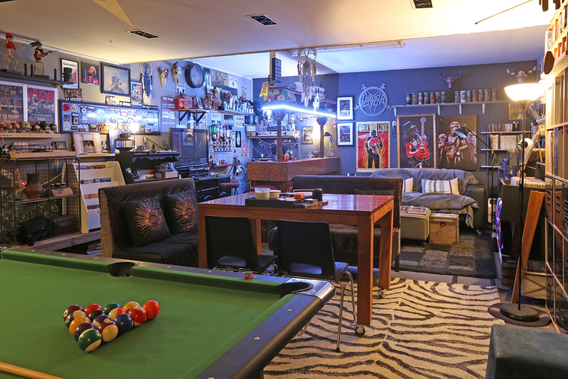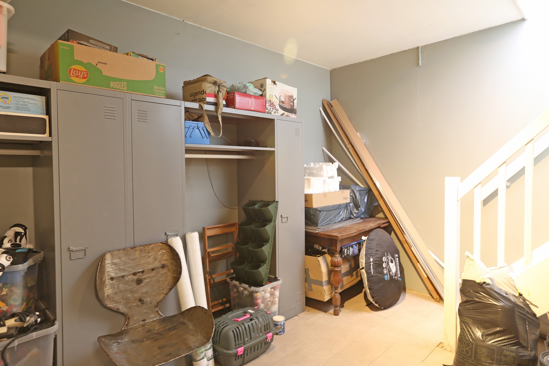 Opbergruimte met deur naar de garage (ca. 5 x 9,5 meter) en naar de ‘mancave’ die in 3 delen is verdeeld, een muziek gedeelte, een game gedeelte en een grote ruime met een gezellige bar en pooltafel, het mancavegedeelte is geïsoleerd.
