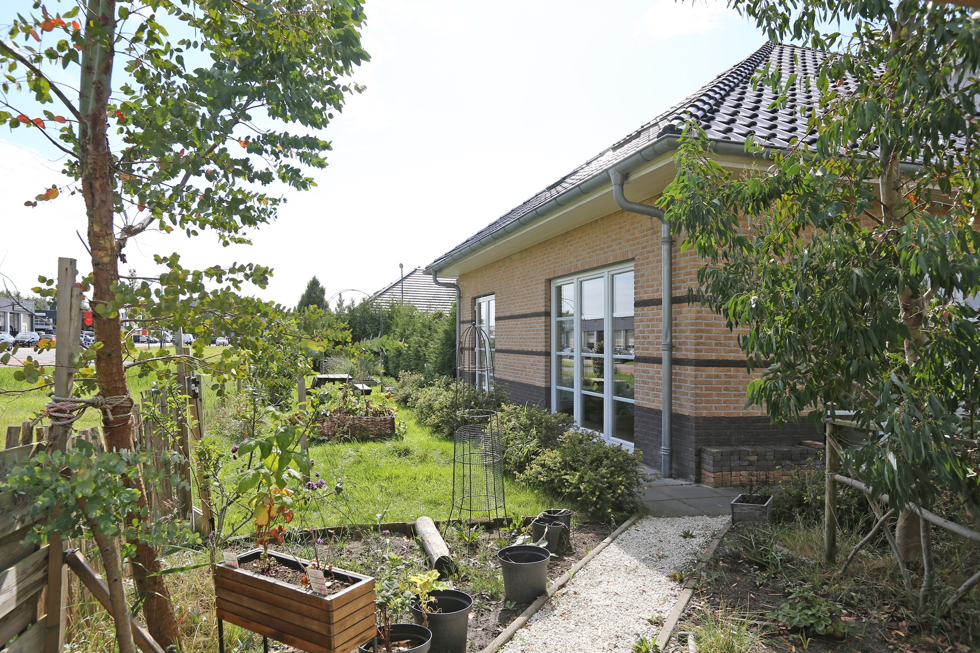 De woning staat op 756m² eigen grond, met aan de achterzijde een fijn terras, aan de zijkant een moestuintje en aan de voorzijde zijn 2 parkeerplaatsen op eigen terrein gemaakt.