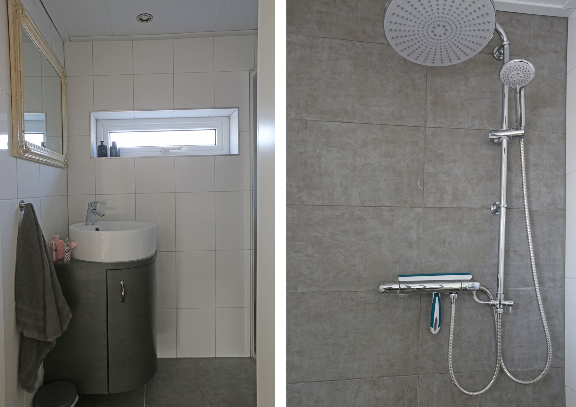Overloop, 3 slaapkamers en een badkamer met douche en wastafelmeubel.