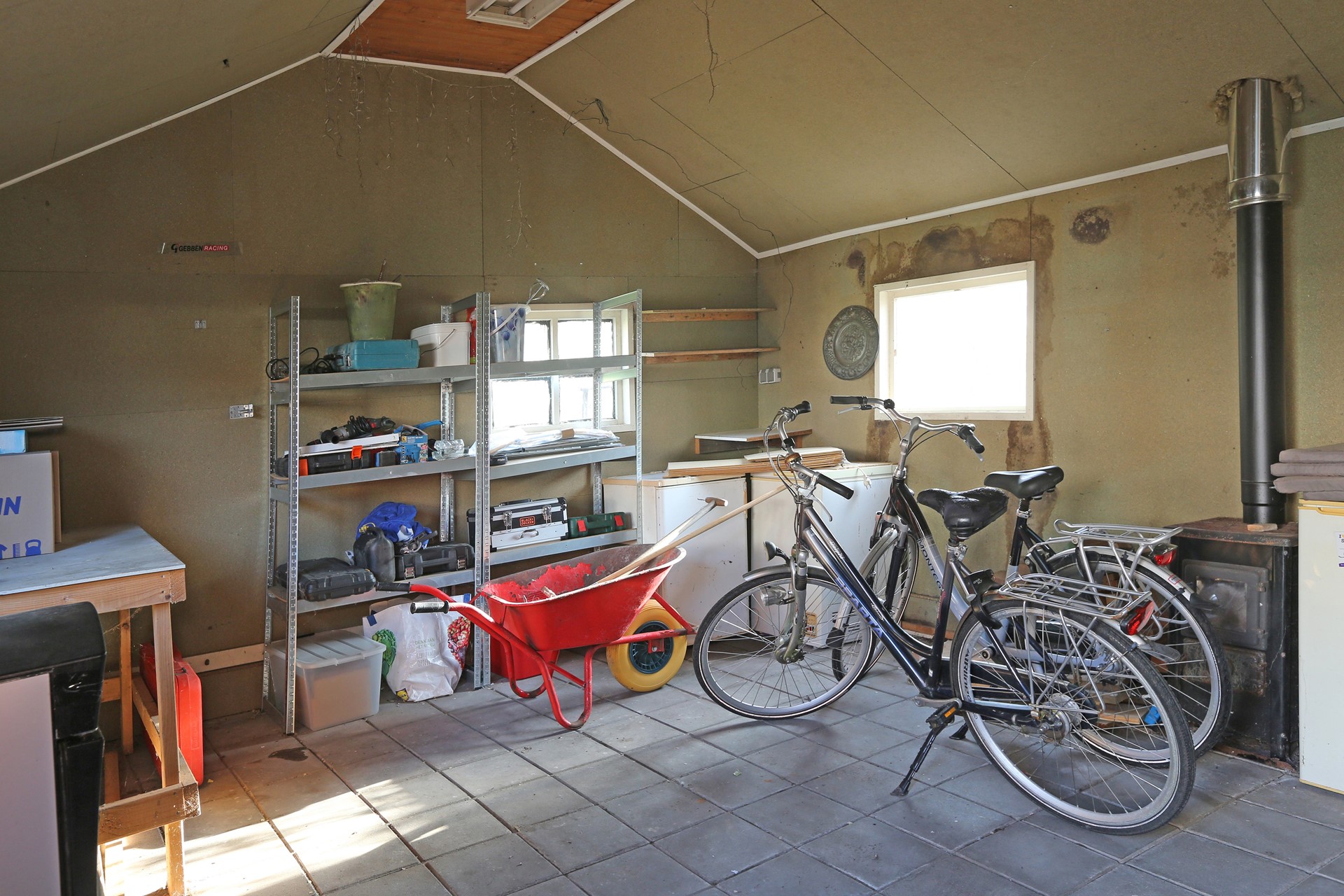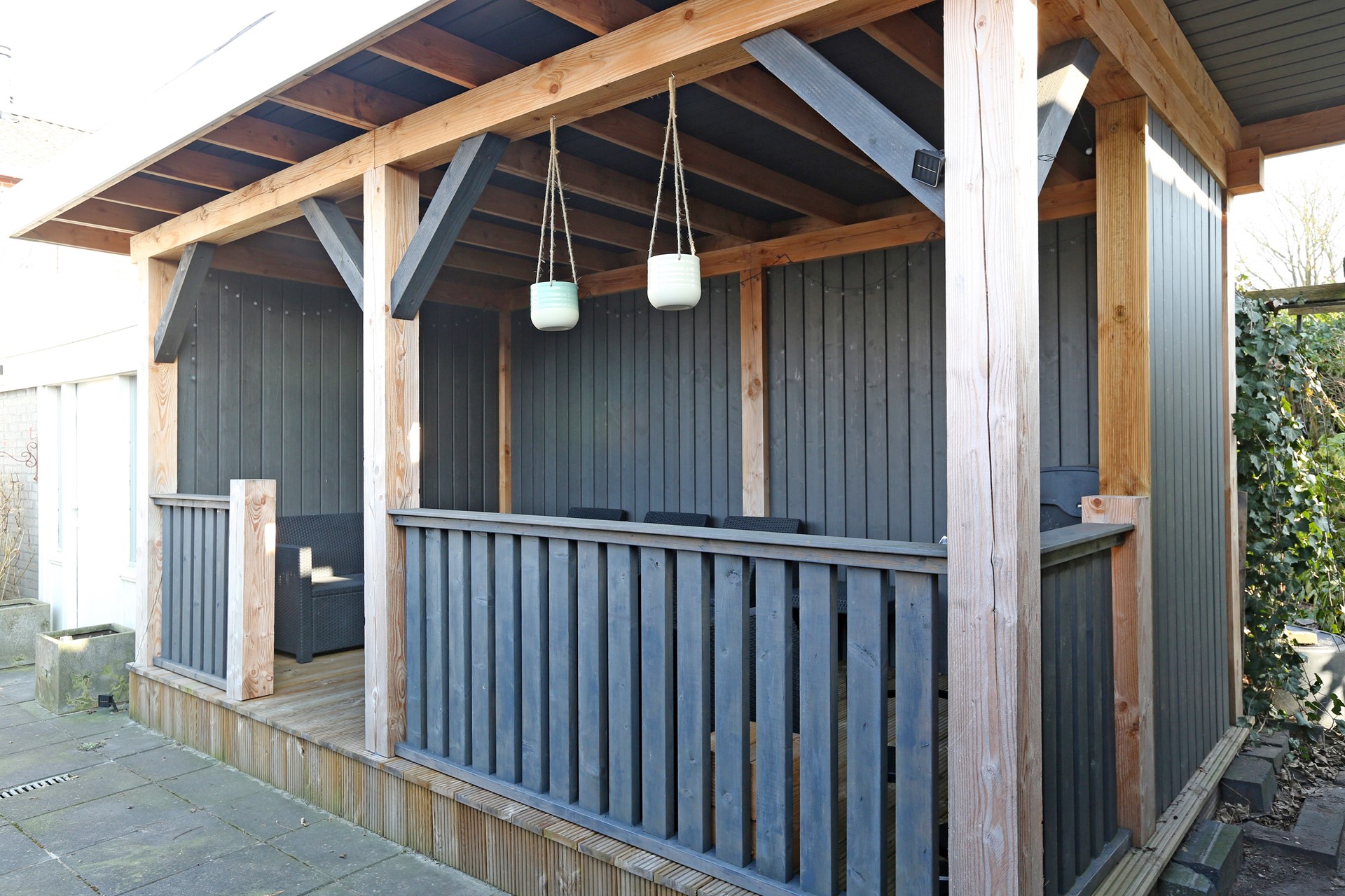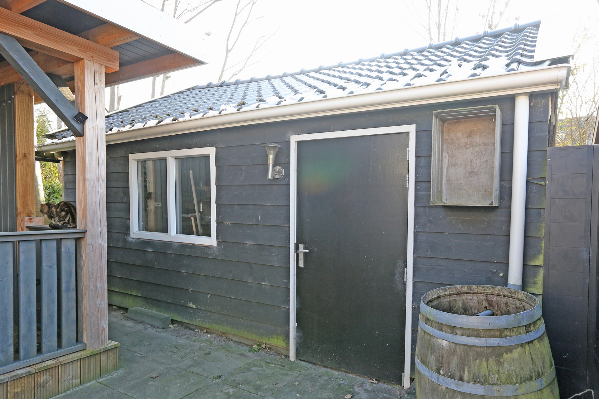 Achter de woning is een diepe achtertuin, gelegen op het zonnige zuiden. Hier is achter de bestaande berging een gezellig overdekt terras gemaakt, heerlijk voor de lange zomeravonden. Achter in de tuin is een grote schuur van ca. 4,5 x 5,5 meter, ideaal voor extra opslag of de handige klusser, er is zelfs een houtkachel aanwezig.
