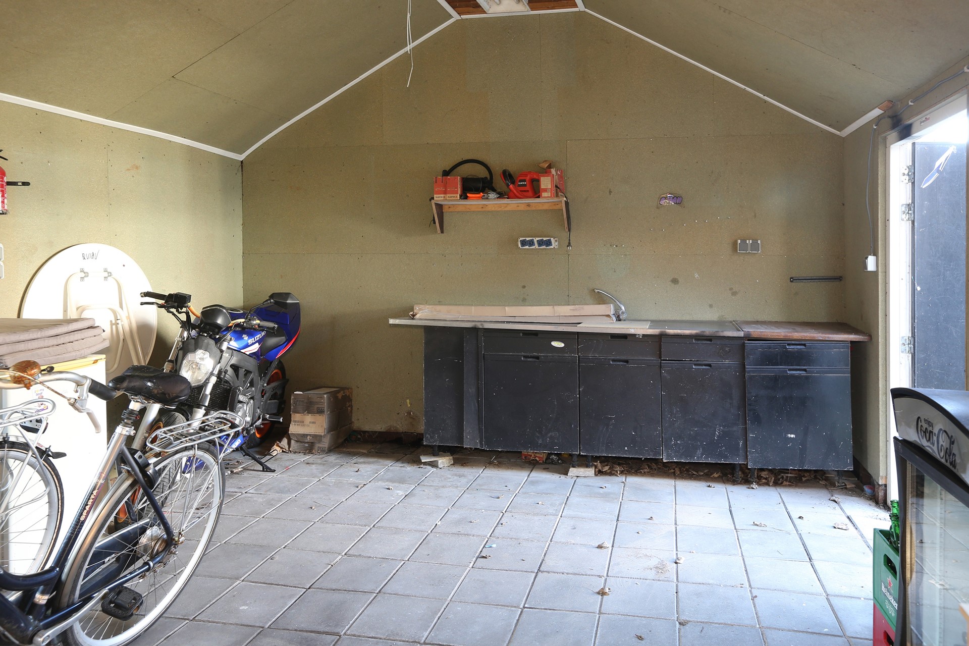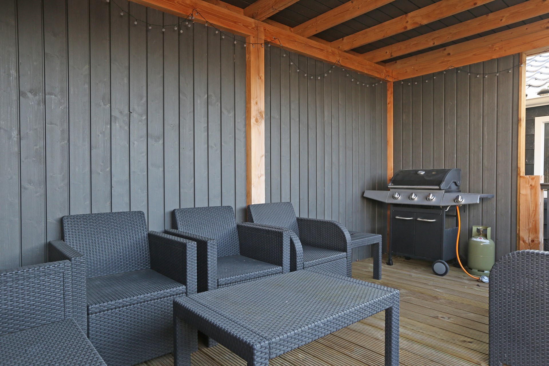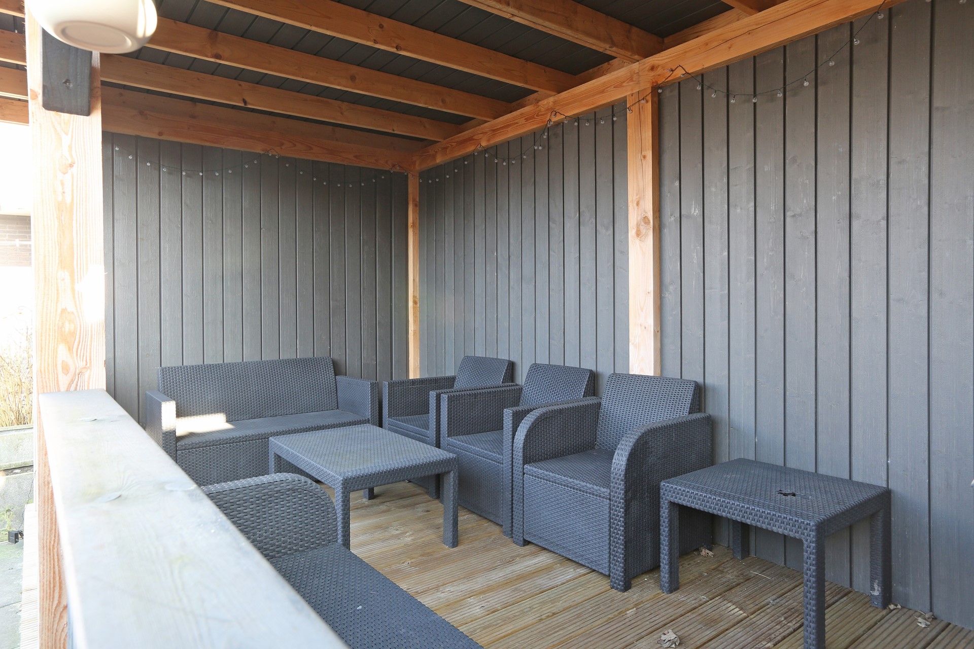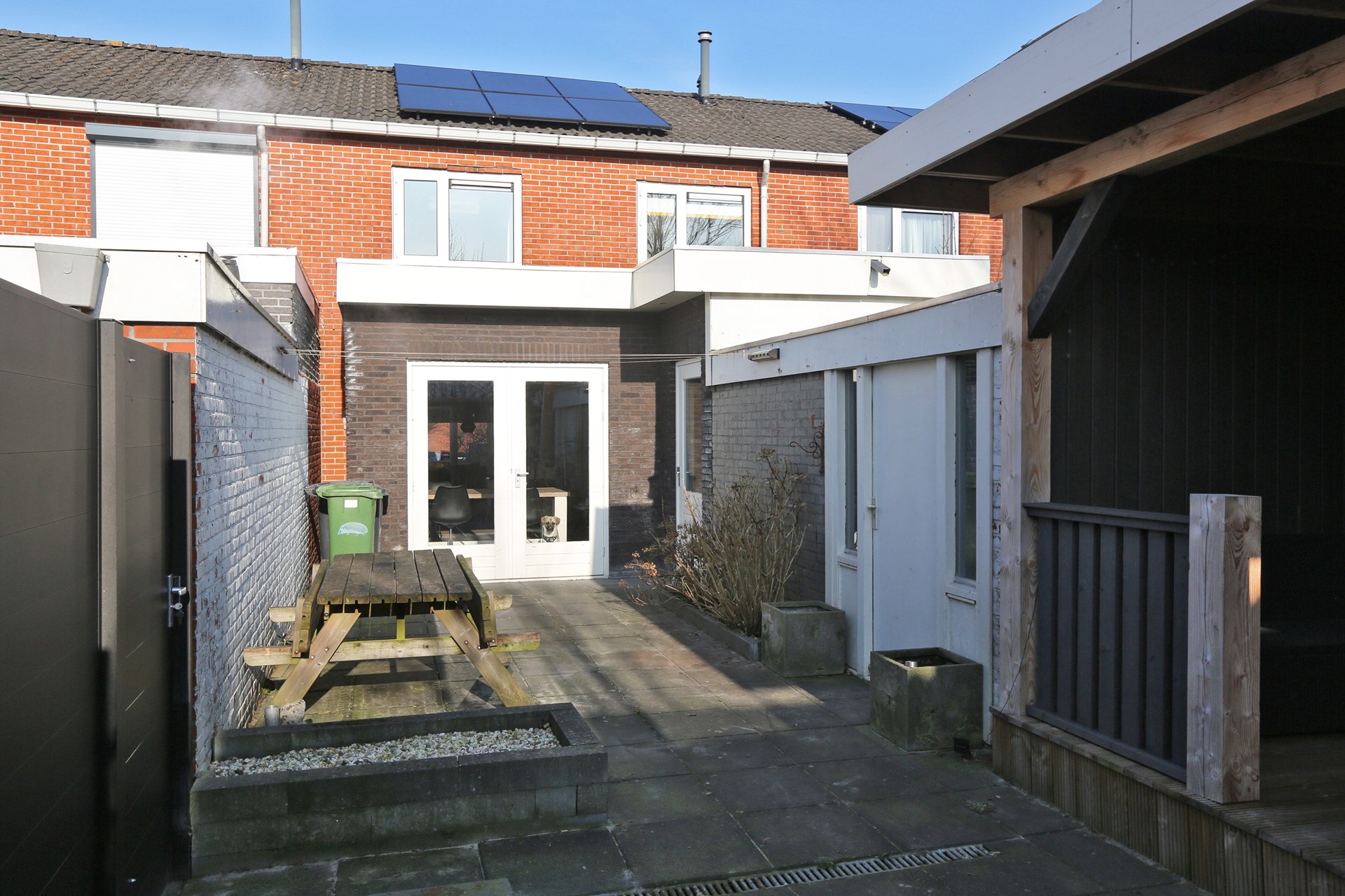 Achter de woning is een diepe achtertuin, gelegen op het zonnige zuiden. Hier is achter de bestaande berging een gezellig overdekt terras gemaakt, heerlijk voor de lange zomeravonden. Achter in de tuin is een grote schuur van ca. 4,5 x 5,5 meter, ideaal voor extra opslag of de handige klusser, er is zelfs een houtkachel aanwezig.
