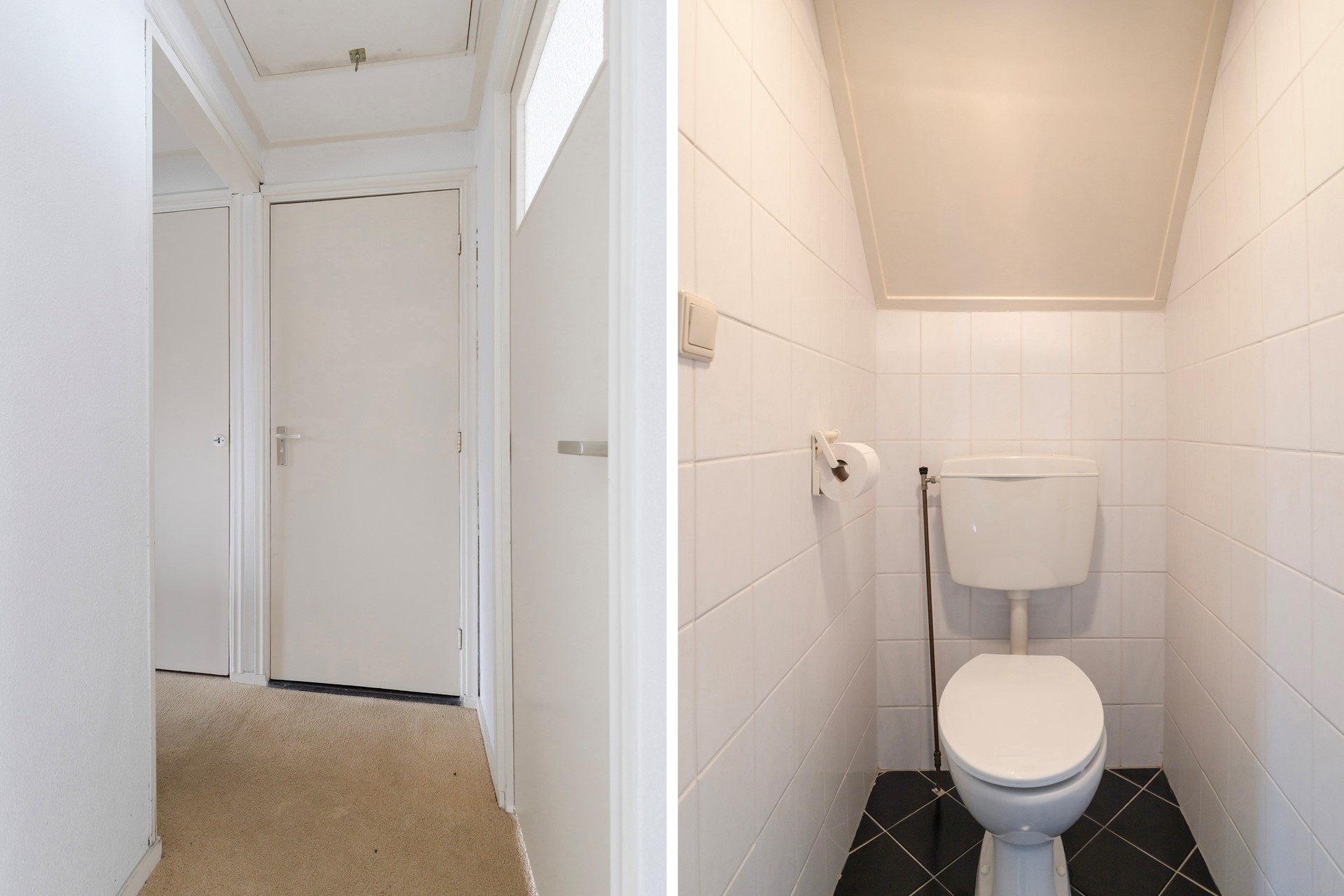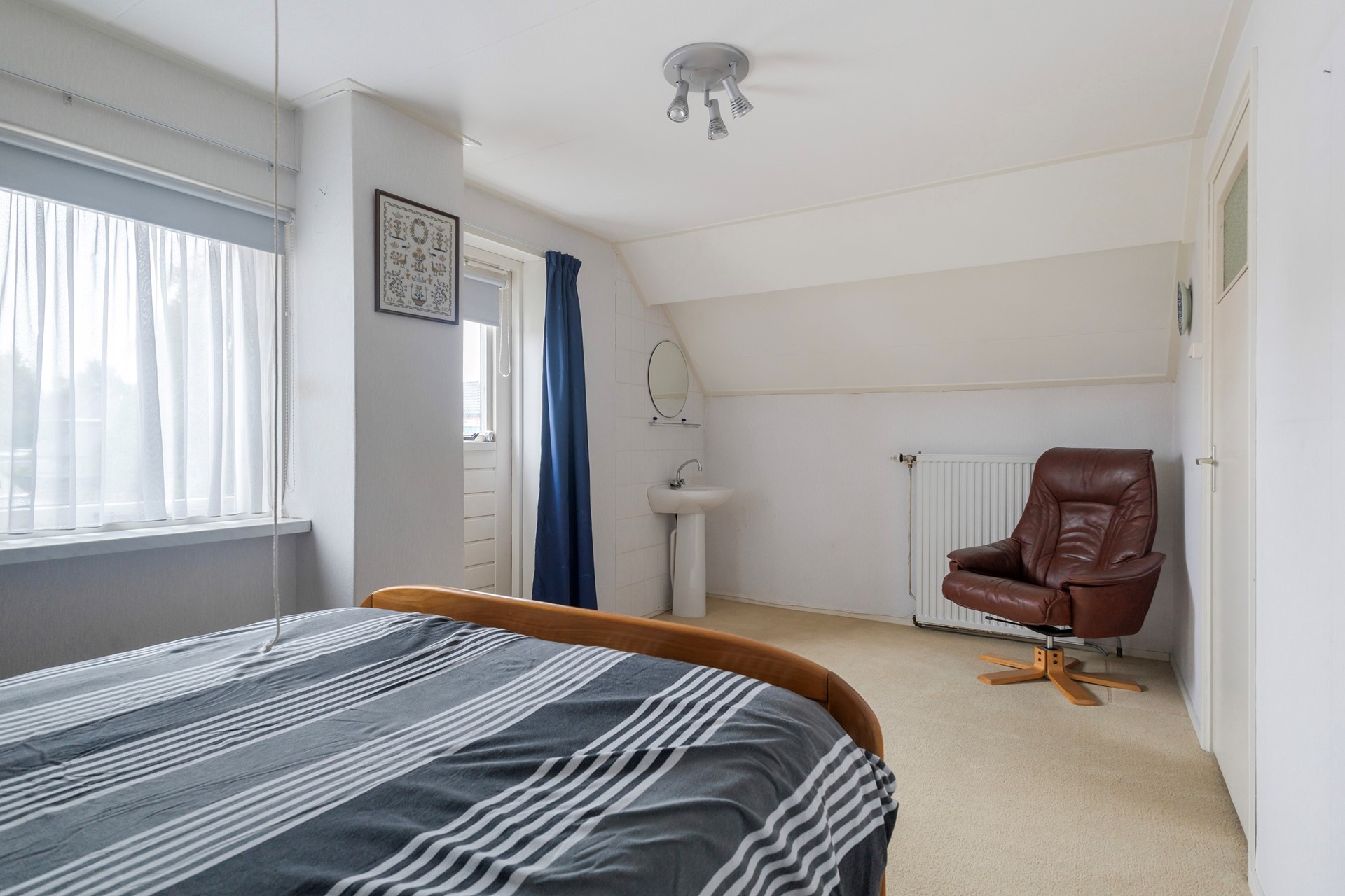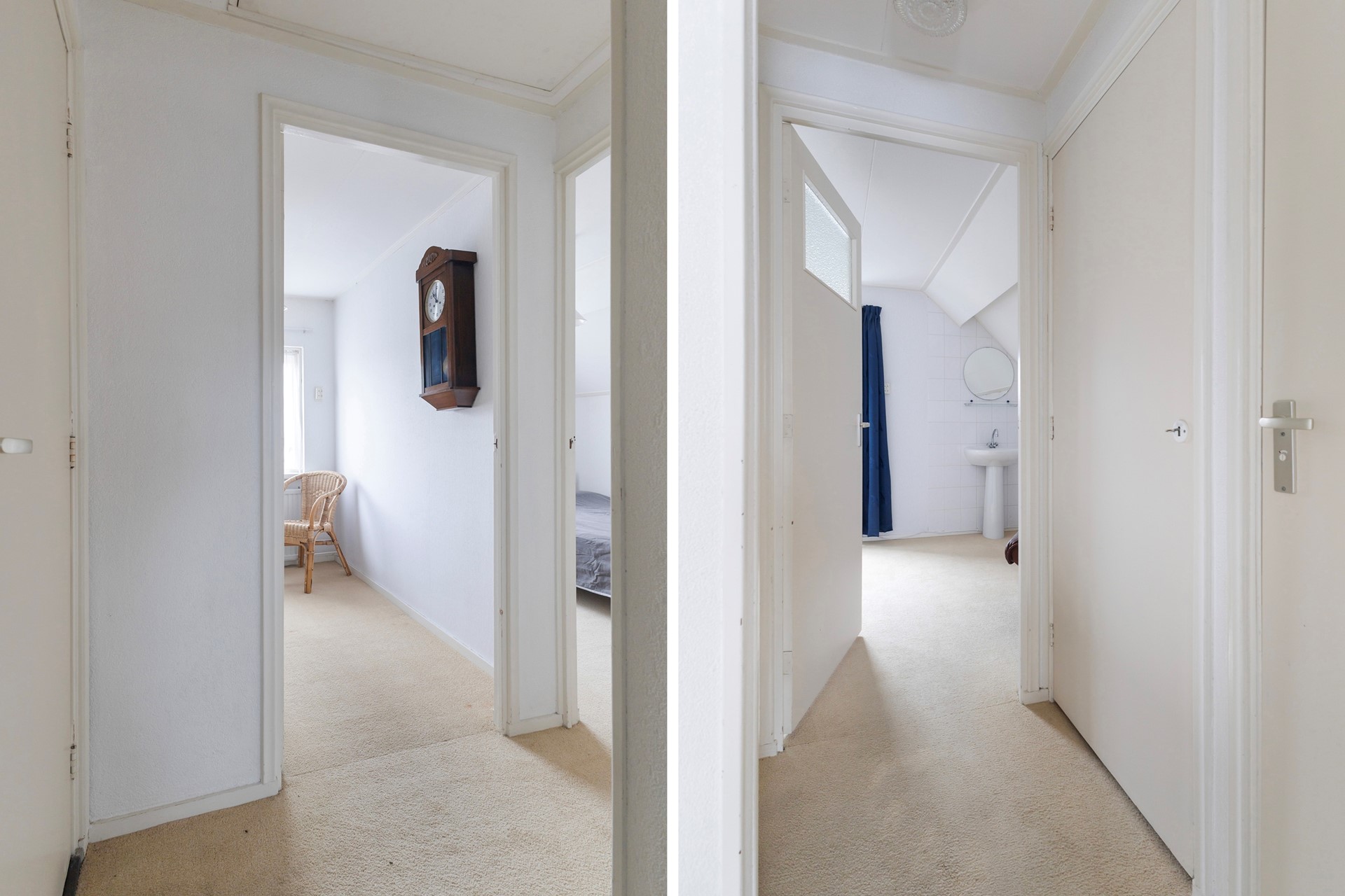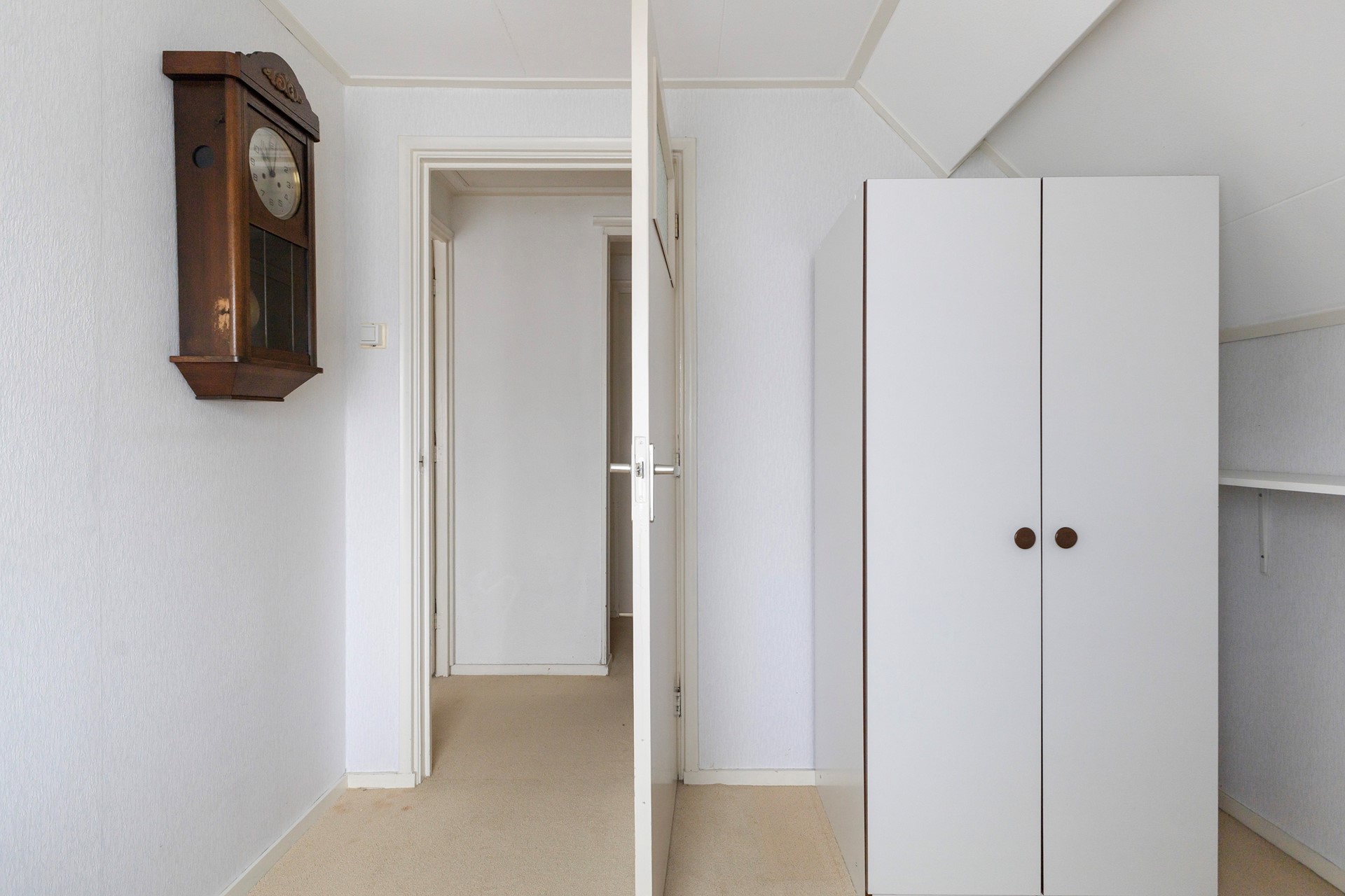 Overloop met een vaste kast, toilet, 3 slaapkamers waarvan 2 met een vaste kast en één met een wastafel en vanuit de achterste kamer is er een deur naar het platte dak.