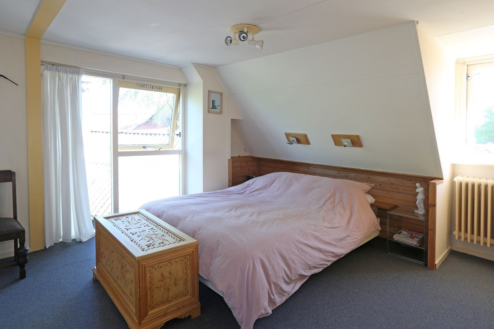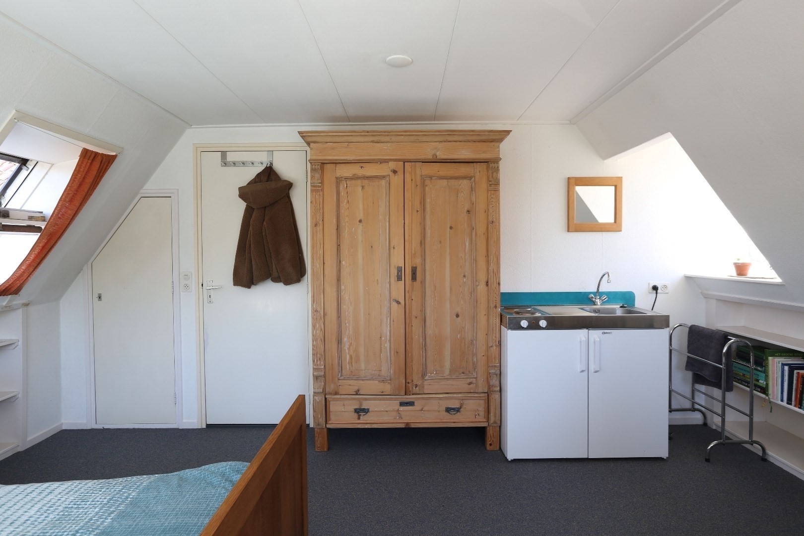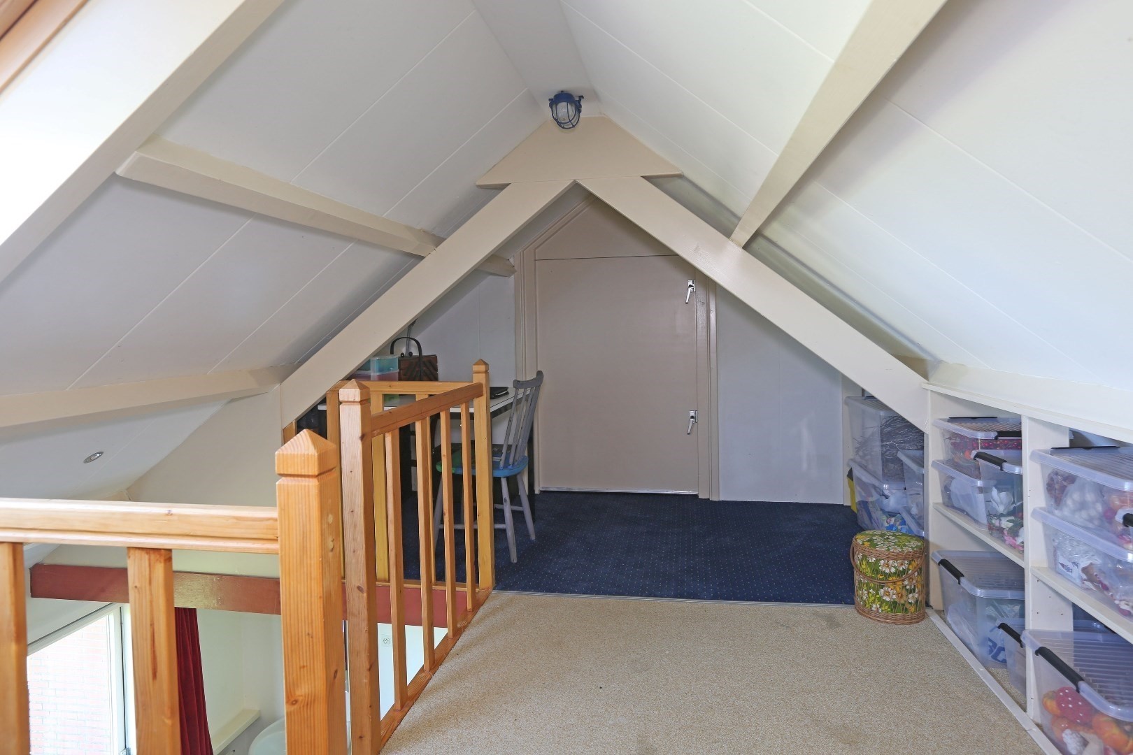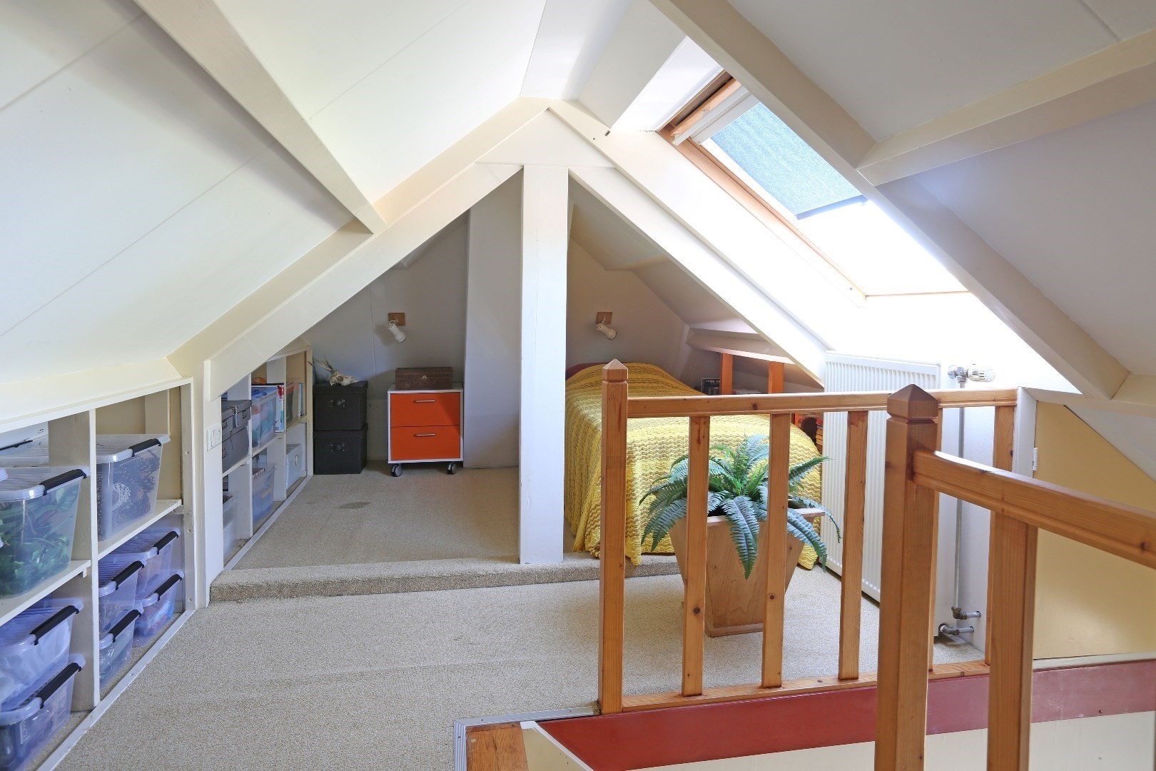 Voorste gedeelte zolderkamer met dakraam en via de vide deurtje naar bergruimte op de zolder.