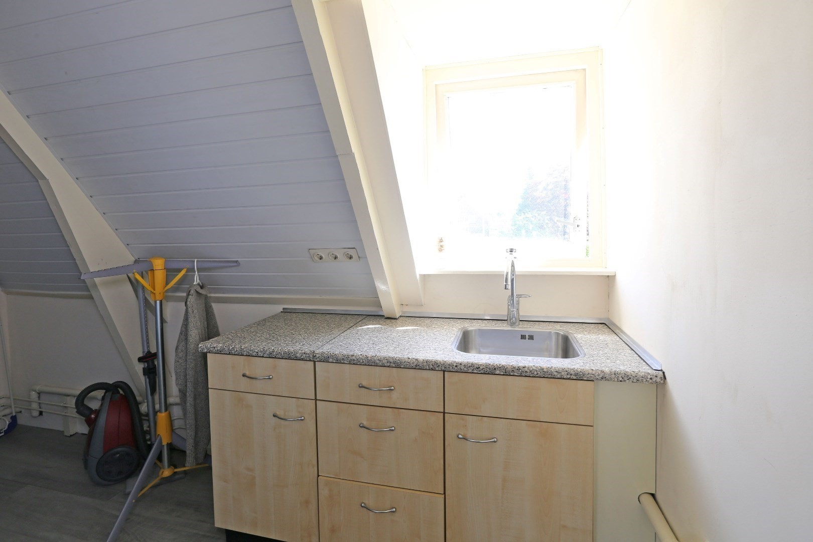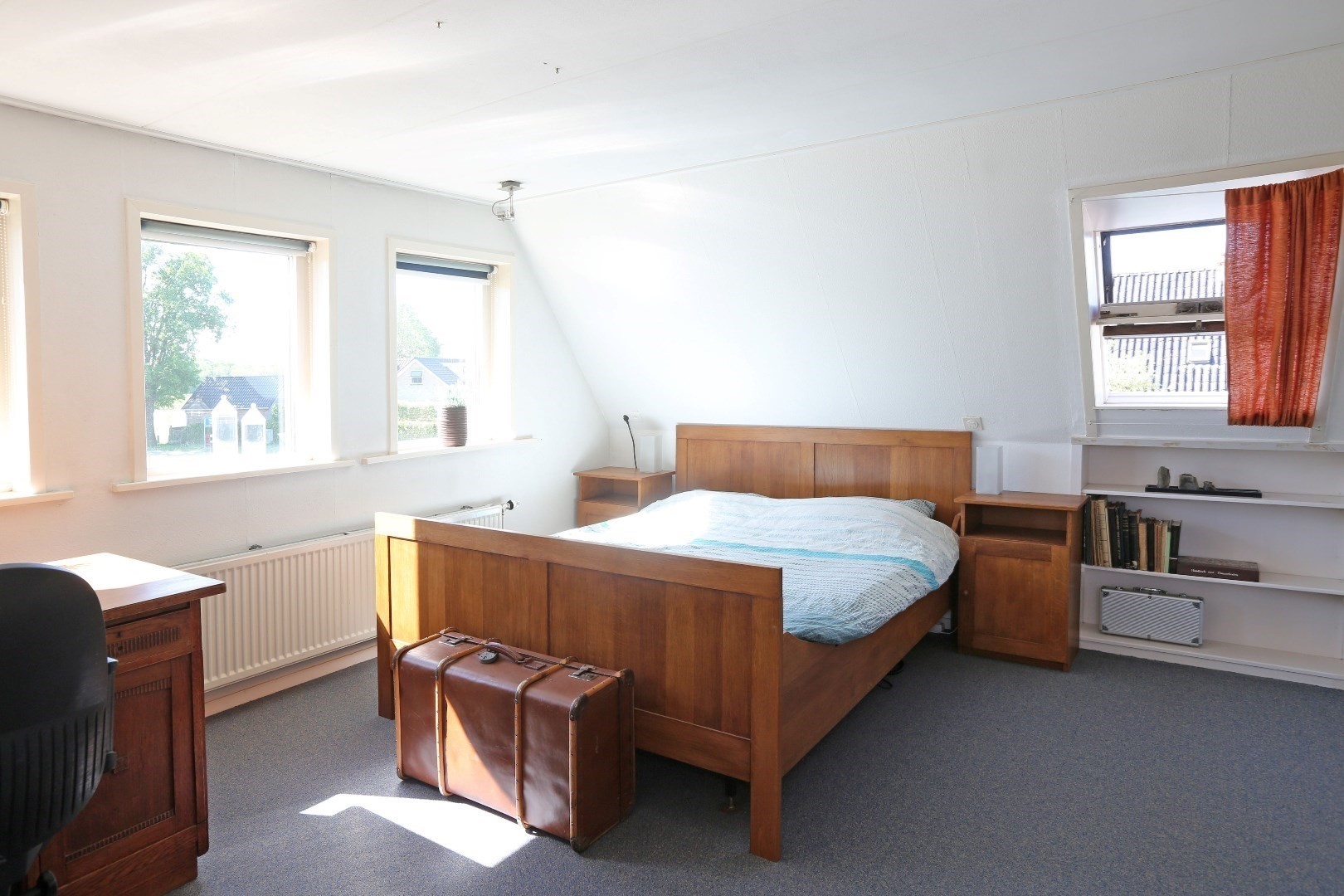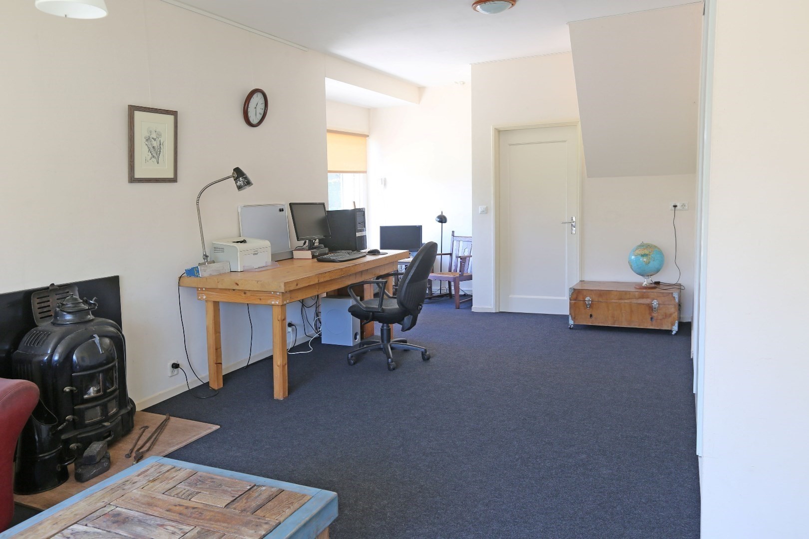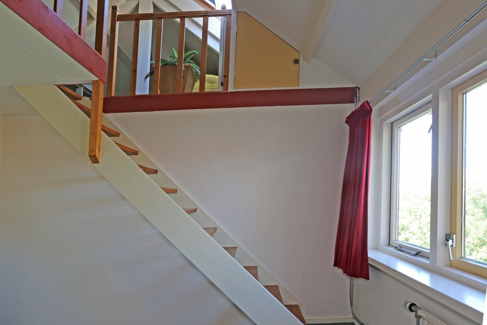 Voorste gedeelte zolderkamer met dakraam en via de vide deurtje naar bergruimte op de zolder.
