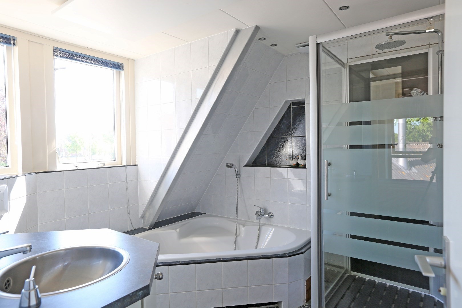 Ruime overloop met openslaande deuren naar balkon, wasruimte met keukenblokje en ruimte voor een droogrek, badkamer met ligbad, wastafelmeubel, douchecabine en toilet, 4 royale slaapkamers, waarvan één met bergruimte achter de knieschotten en een pantry, één met kastenwand en deur naar de badkamer, één met een wastafel en inbouwkasten en één met een wastafel en trap naar de vide op de 3e woonlaag.